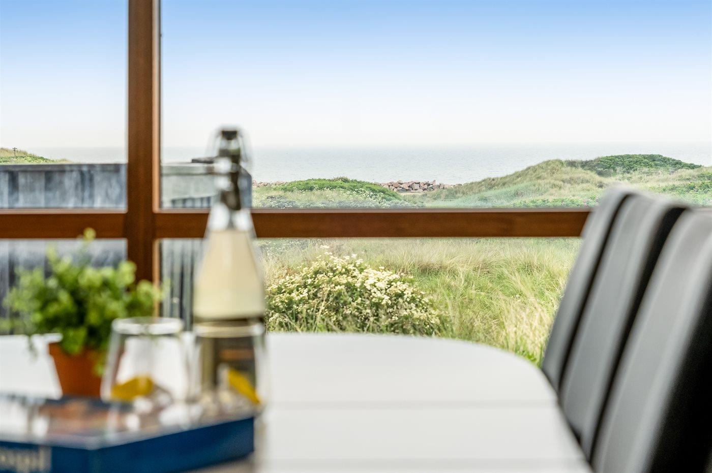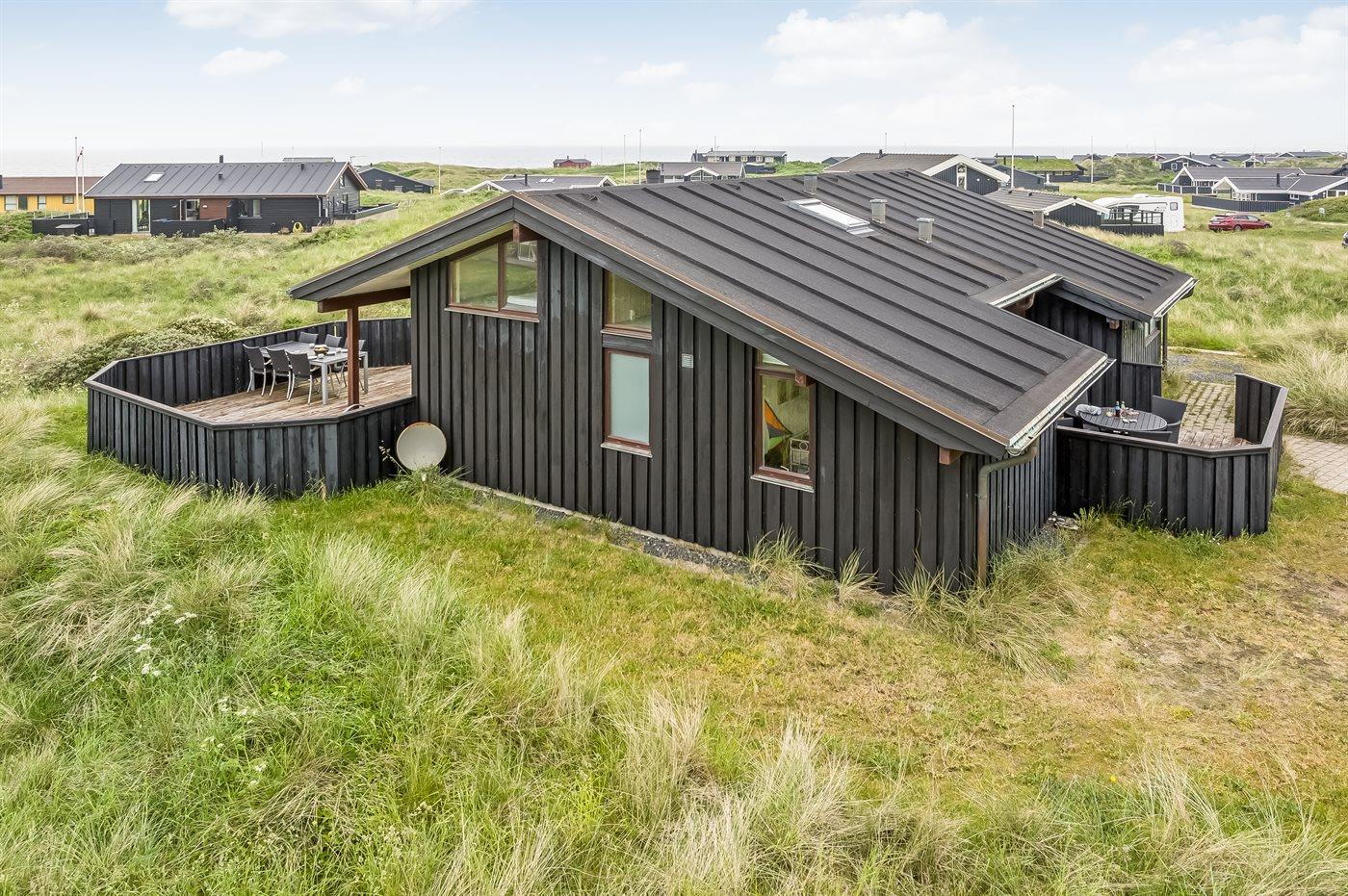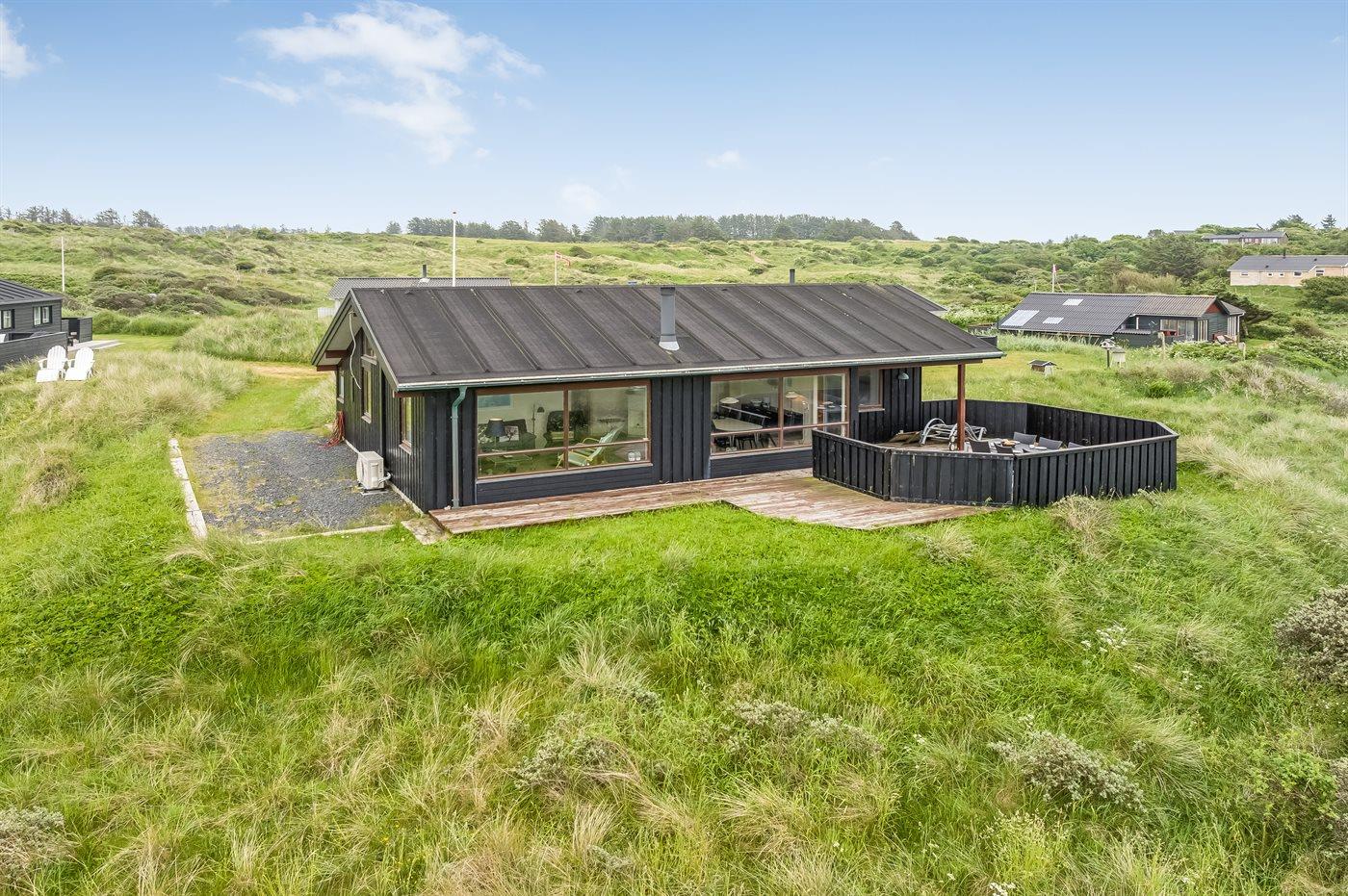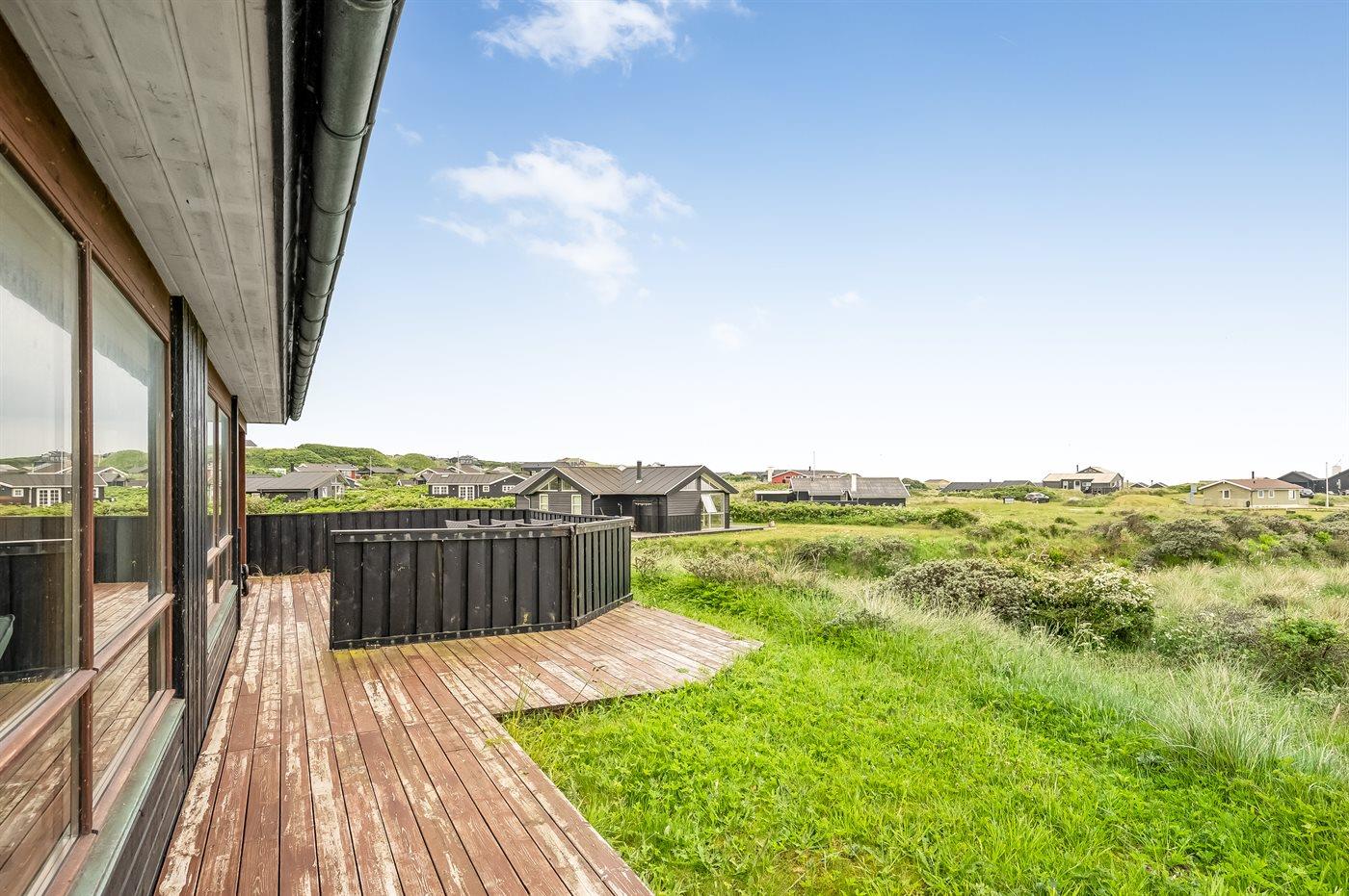 Sommerhus beliggende på kuperet grund med udsigt til Vesterhavet og klitterne.