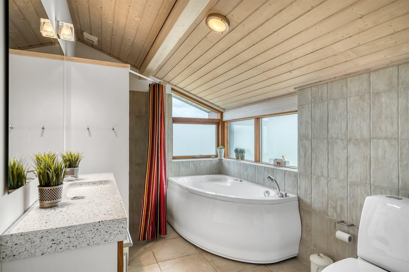 Der er 2 badeværelser med bruseniche og 2 toiletter, heraf 1 gæstetoilet. Der er gulvvarme på 2 badeværelser. Der er gulvvarme på gæstetoilettet.
