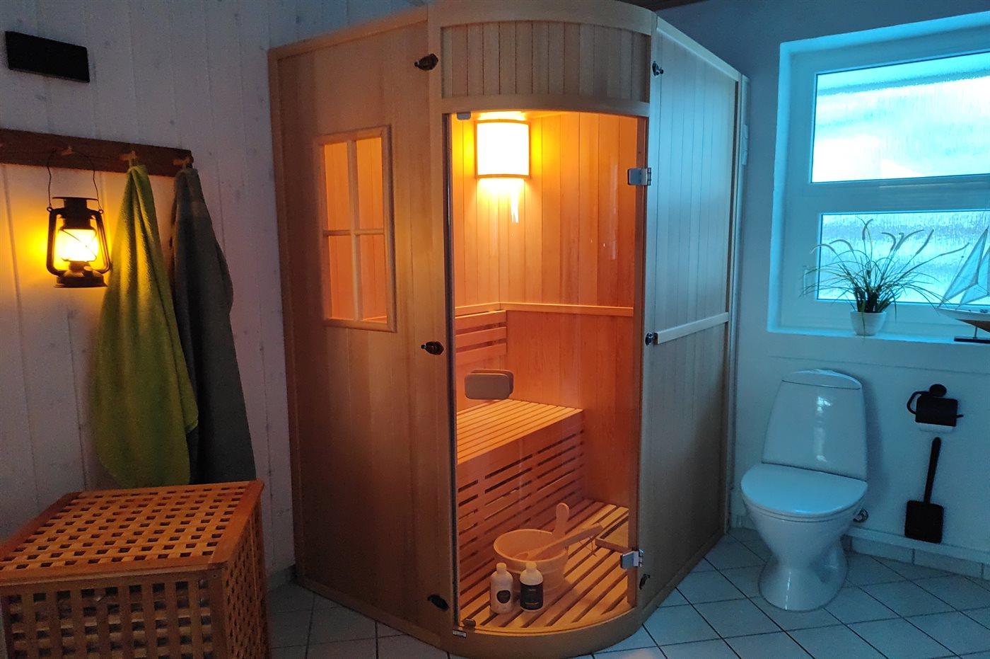 Der er 1 badeværelse med bruseniche og 2 toiletter, heraf 1 gæstetoilet. Der er gulvvarme på 1 badeværelse. Der er gulvvarme på gæstetoilettet. I saunaen er der mulighed for afslapning.
