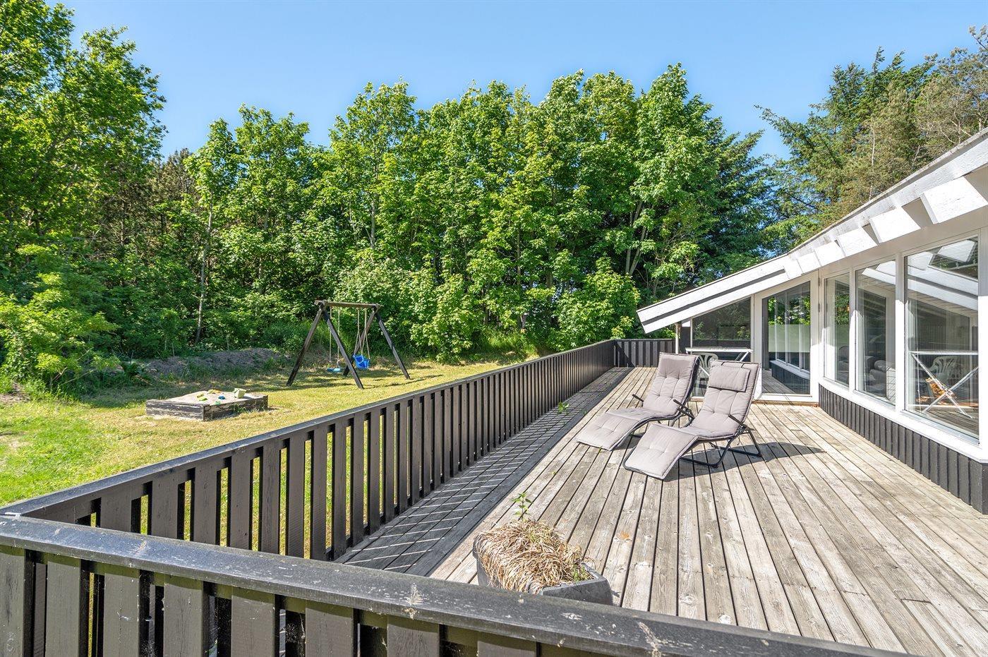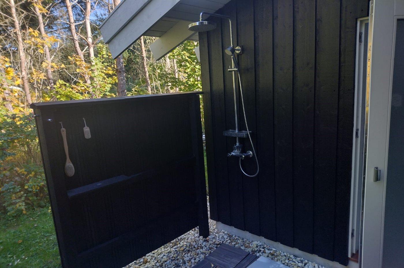 Ferieboligen er beliggende på en 1725 m² stor naturgrund. Der er 800 m til havet. Nærmeste forretning er beliggende i en afstand af 400 m. Til ferieboligen hører 80 m² terrasseareal. Desuden er der 20 m² overdækket terrasse. Der er redskabsrum. Gynge. Sandkasse. Bålsted. Shelter. Udendørs bruser. Grill til rådighed. Der er installeret stik til opladning af elbil. Med 7 kW ladeeffekt. Parkering ved ferieboligen.