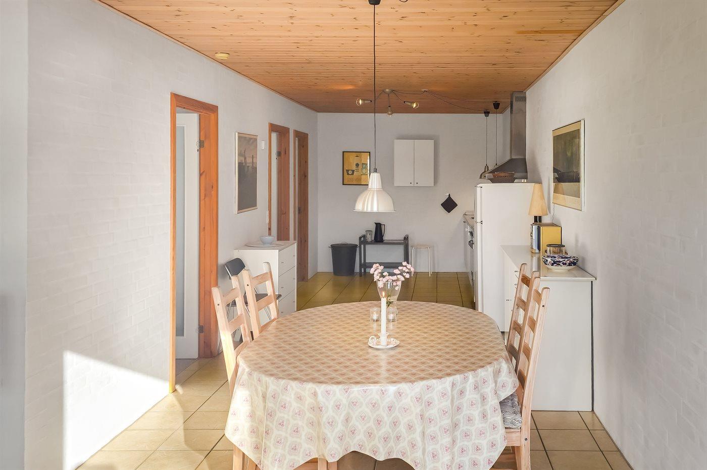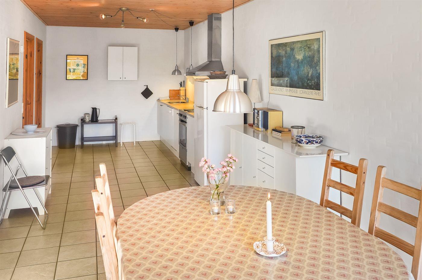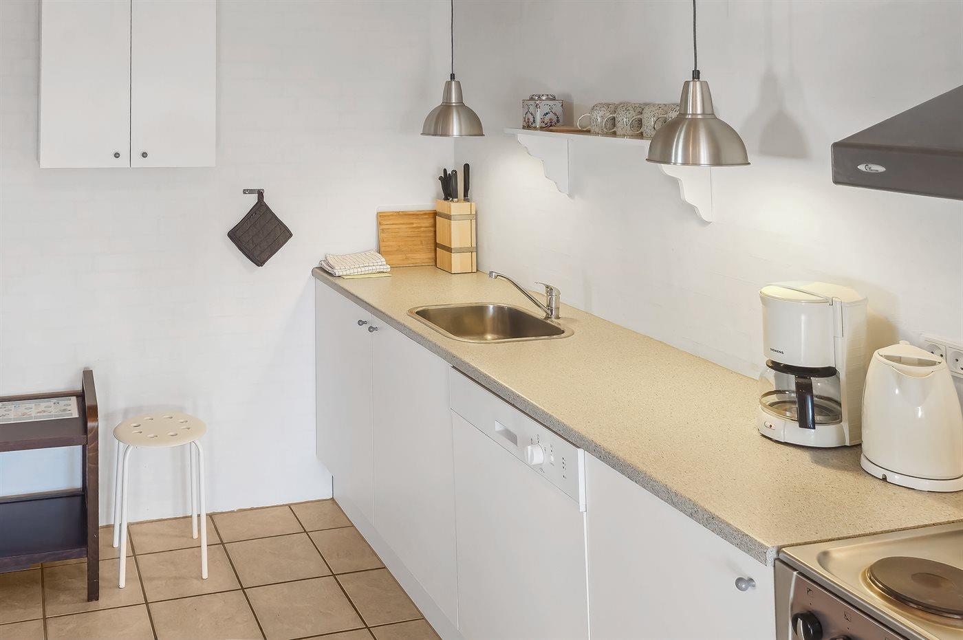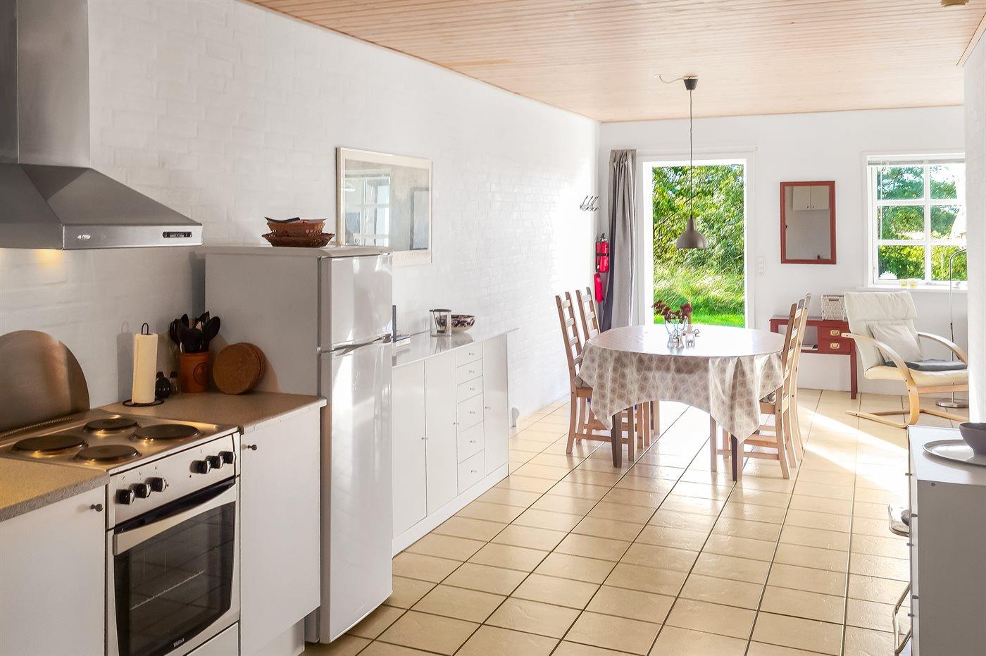 Køkkenet er udstyret med 1 køleskab. Der er 4 elkogeplader, varmluftovn samt opvaskemaskine Der er gulvvarme i køkkenet.