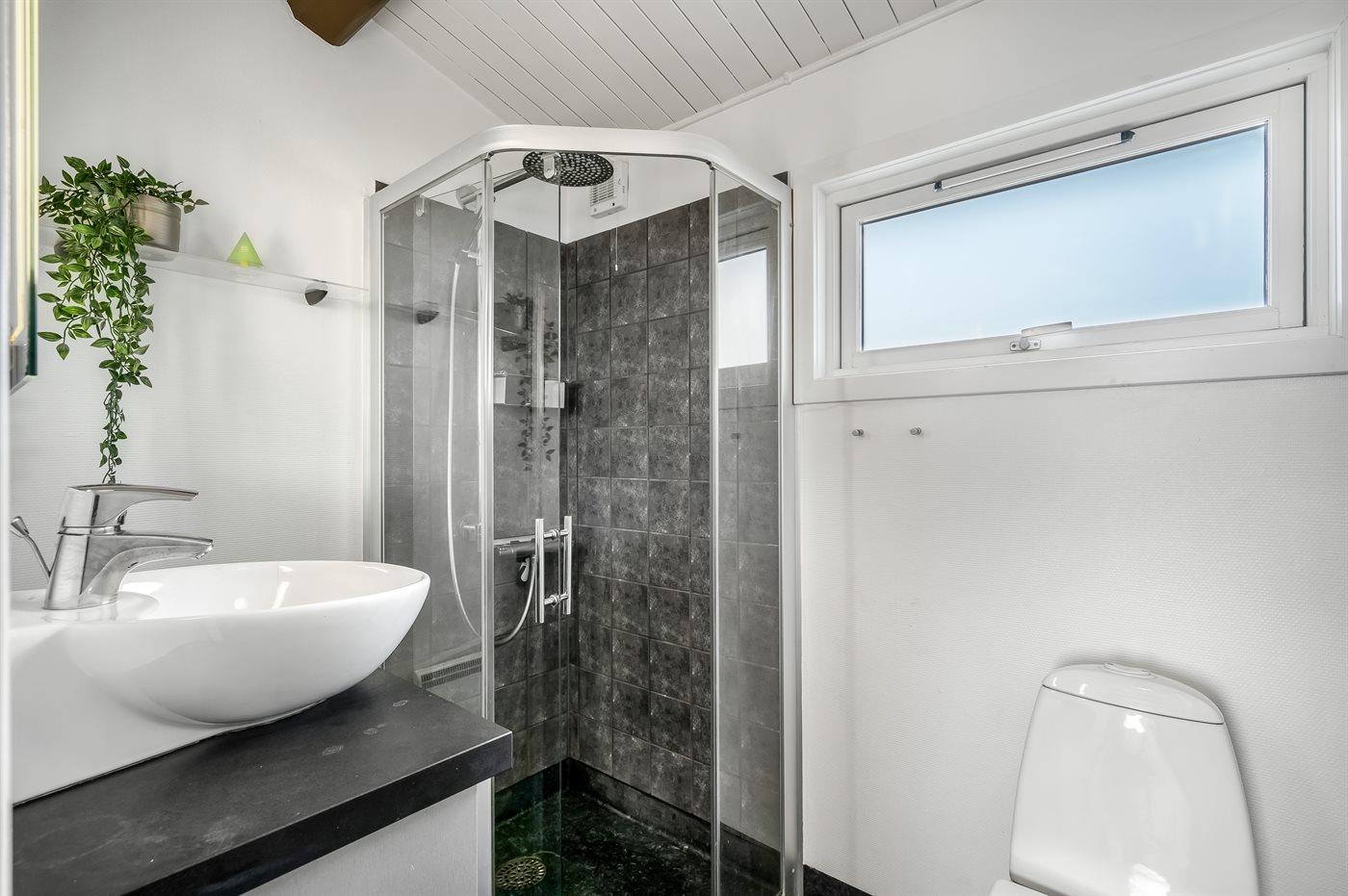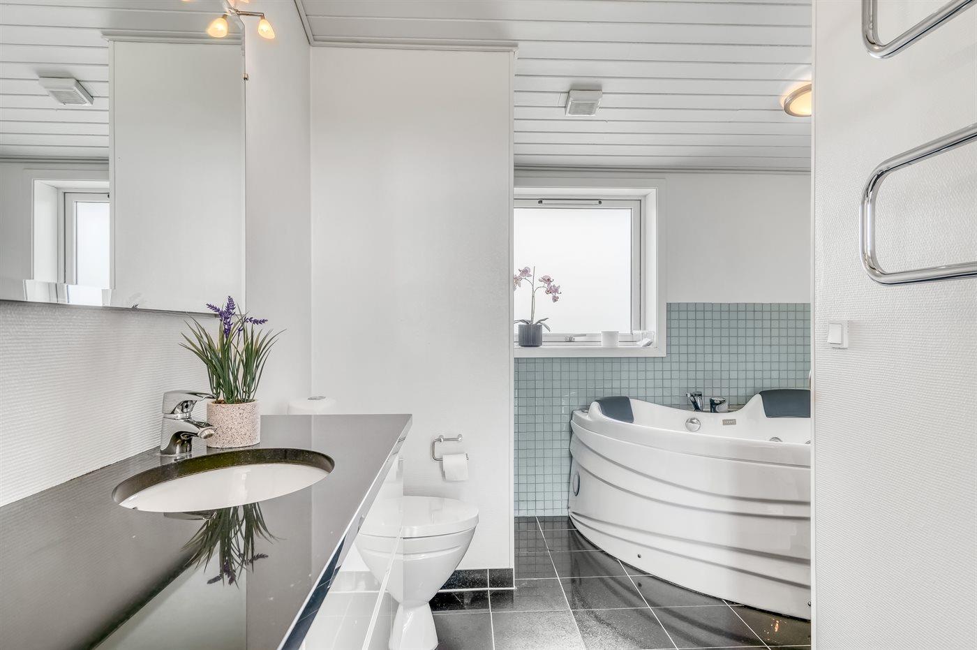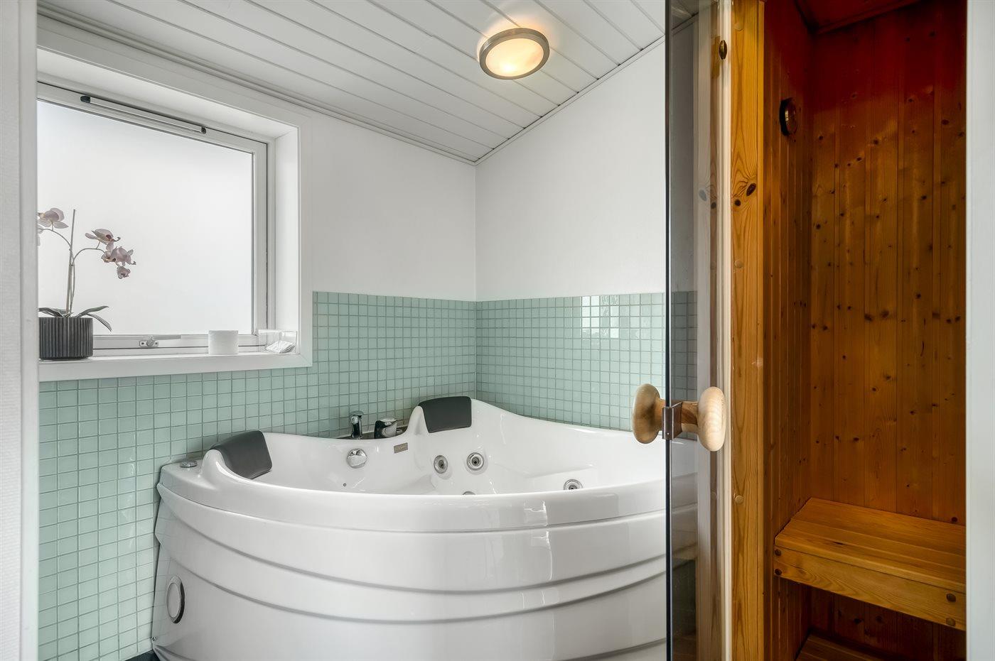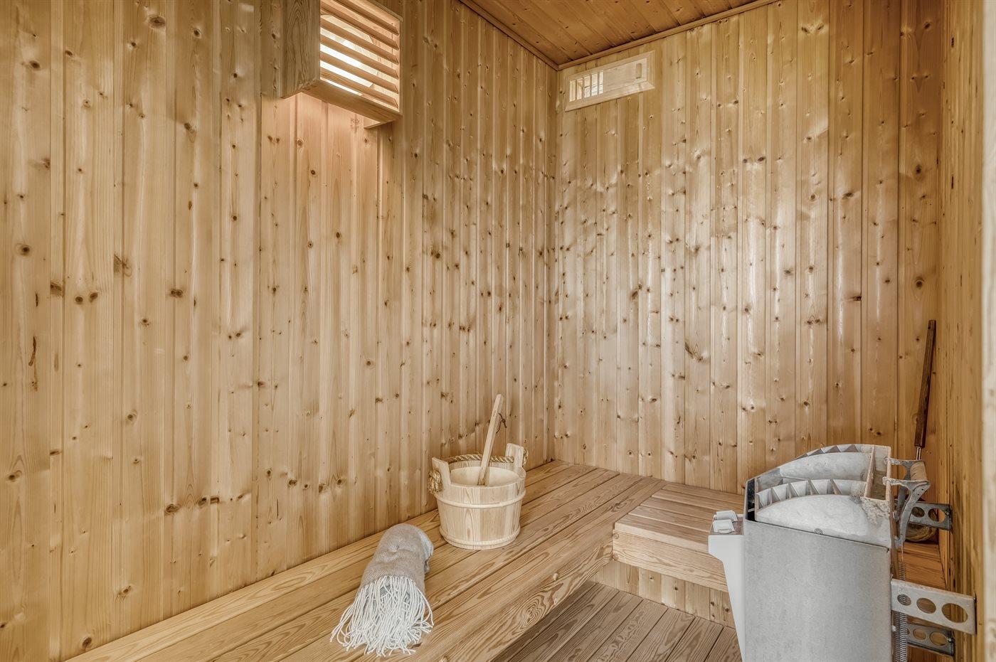 Der er 2 badeværelser med bruseniche og 2 toiletter. Der er gulvvarme på 1 badeværelse. I saunaen er der mulighed for afslapning.