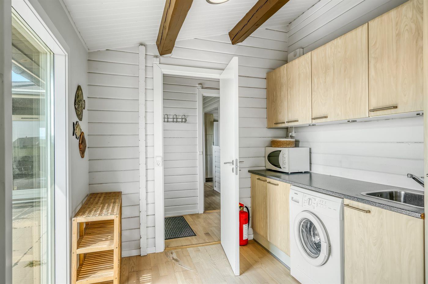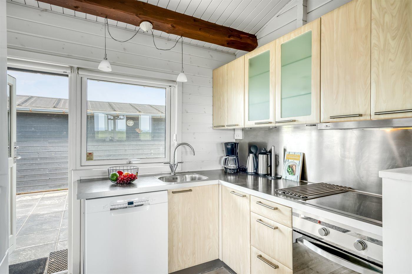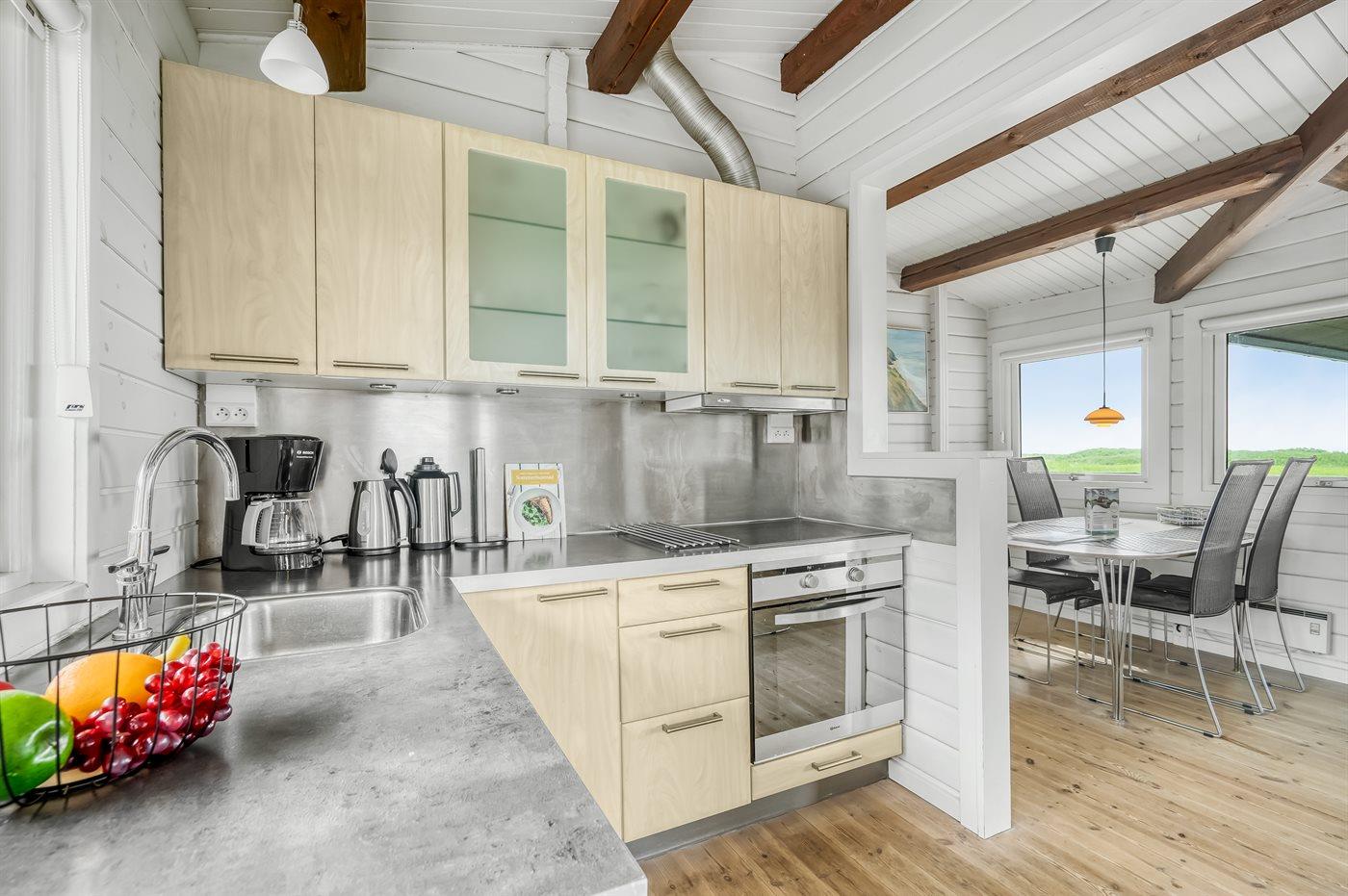 Køkkenet er udstyret med 1 køleskab. Der er 4 keramiske kogeplader, varmluftovn, mikrobølgeovn samt opvaskemaskine.