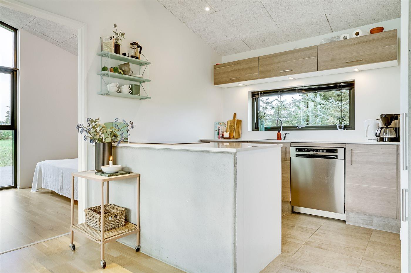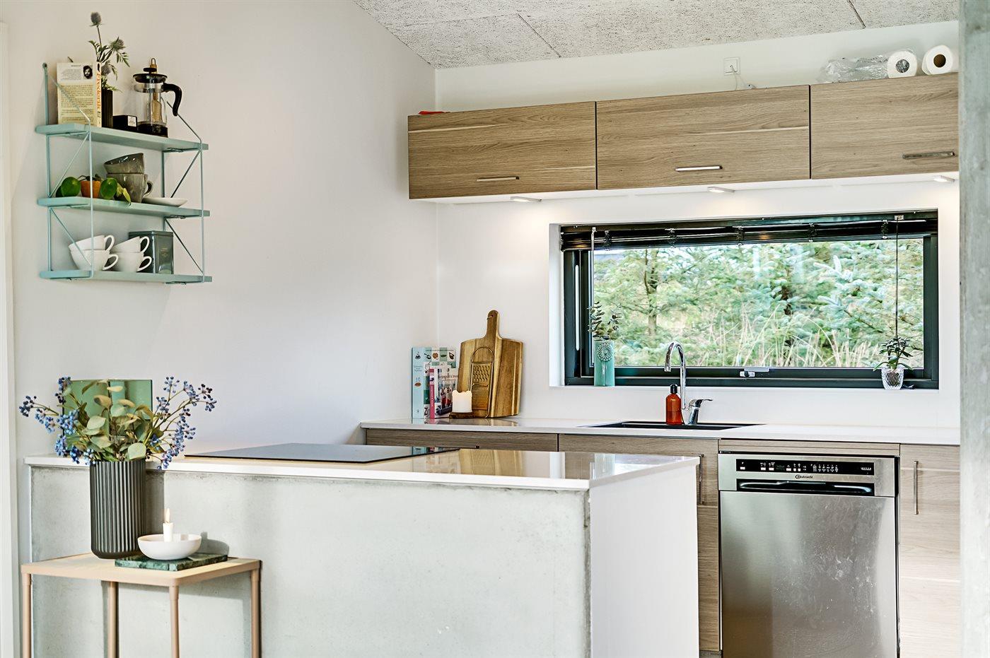 Køkkenet er udstyret med 1 køleskab. Der er 4 induktionskogeplader, varmluftovn samt opvaskemaskine.