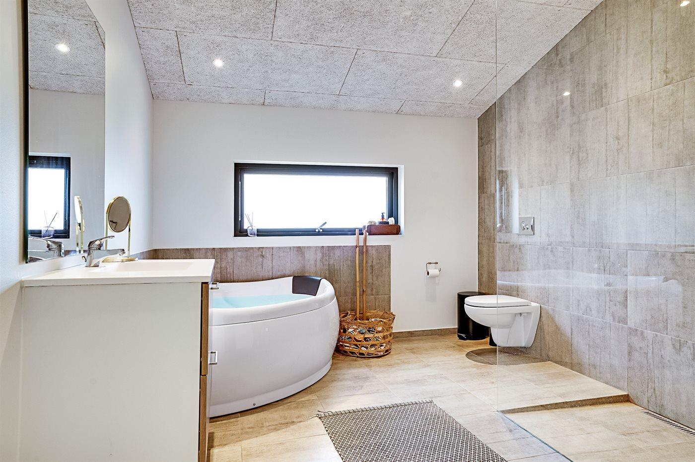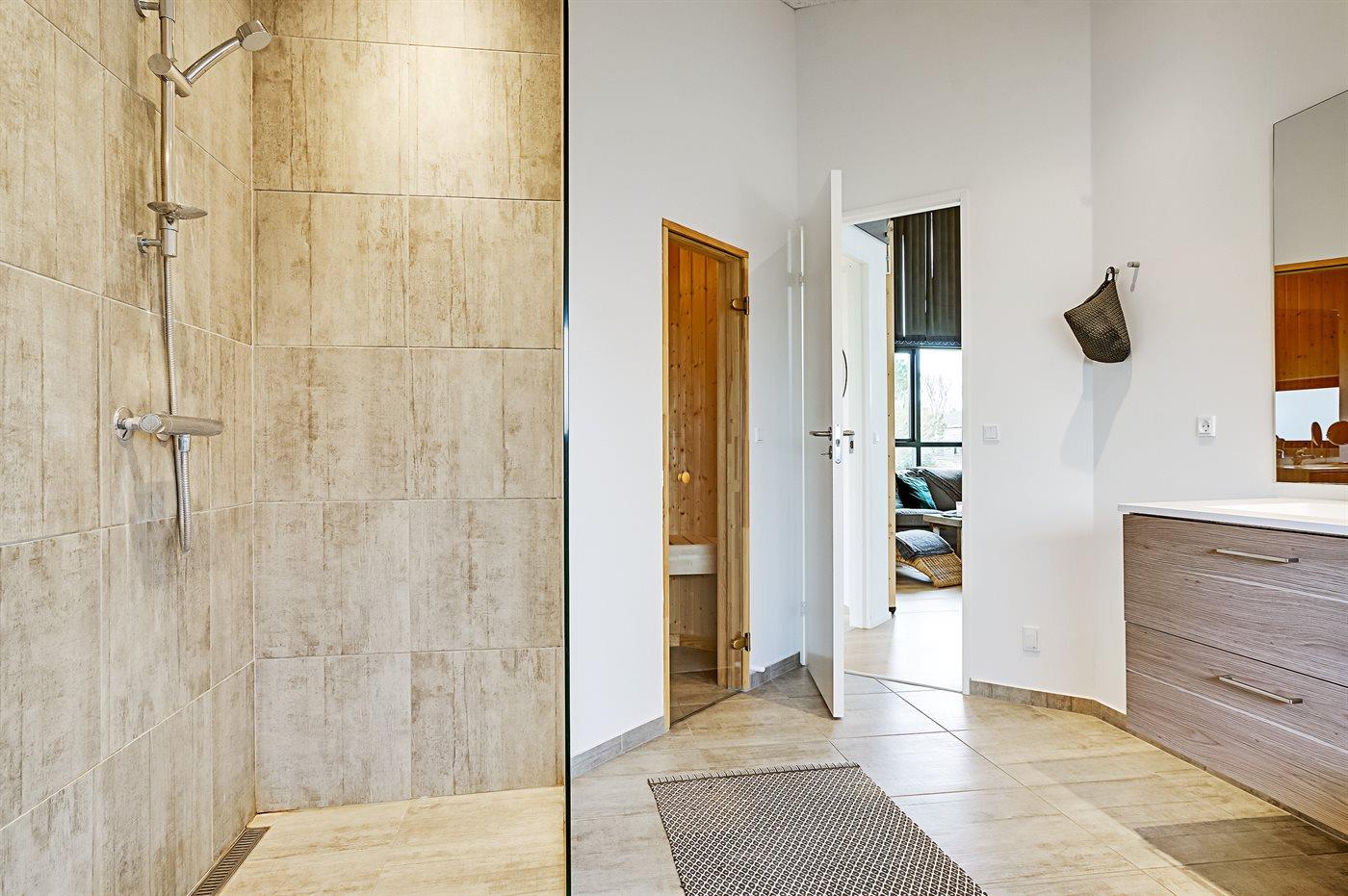 Der er 1 badeværelse med bruseniche og 2 toiletter, heraf 1 gæstetoilet. Der er gulvvarme på 1 badeværelse. Der er gulvvarme på gæstetoilettet. I saunaen er der mulighed for afslapning.