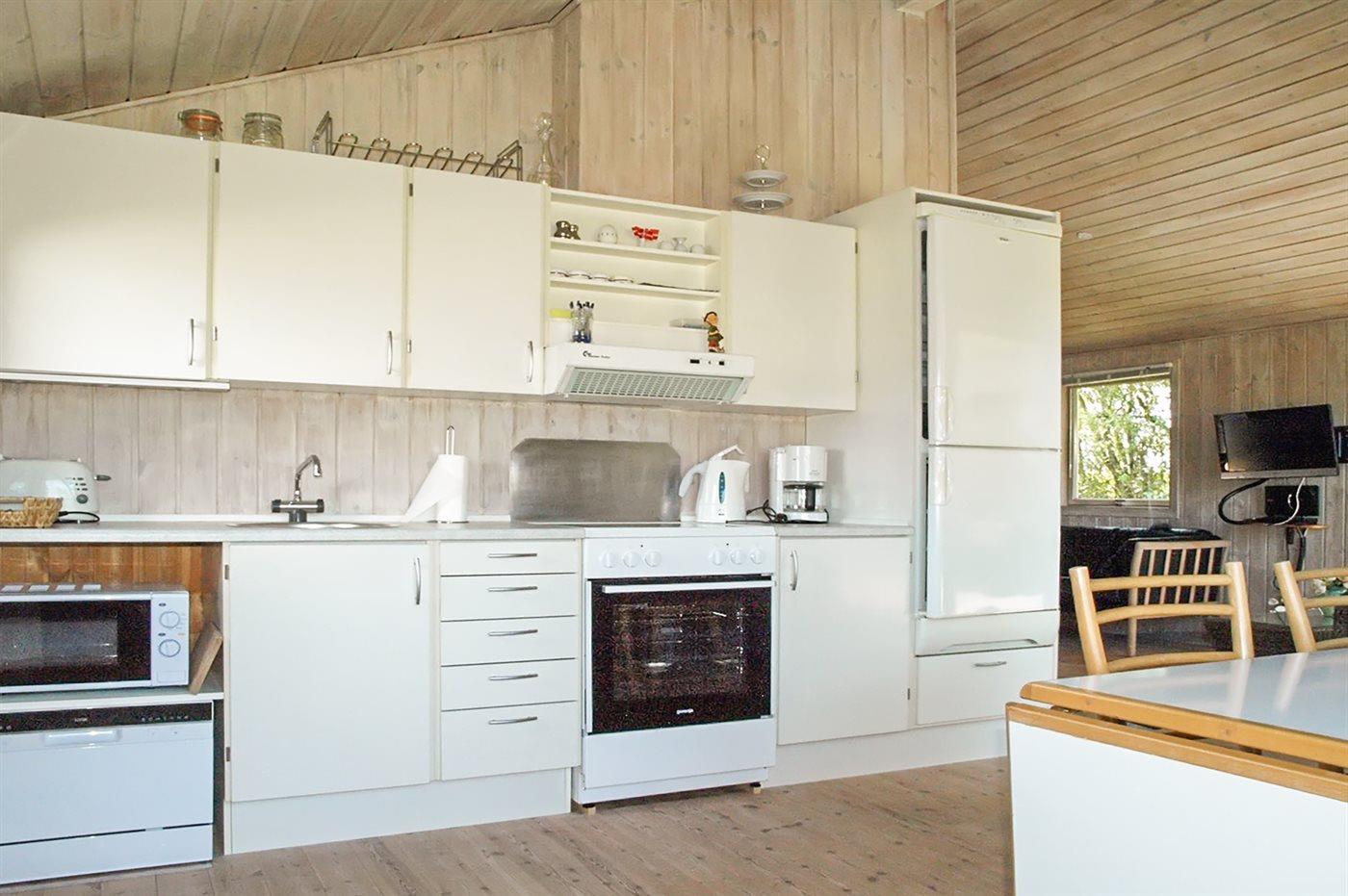 Køkkenet er udstyret med 1 køleskab. Der er 4 keramiske kogeplader, varmluftovn, mikrobølgeovn samt opvaskemaskine.