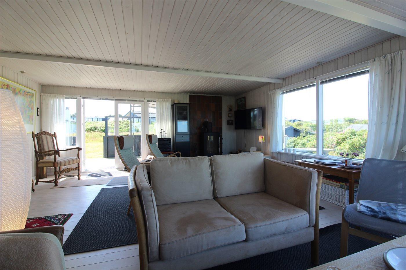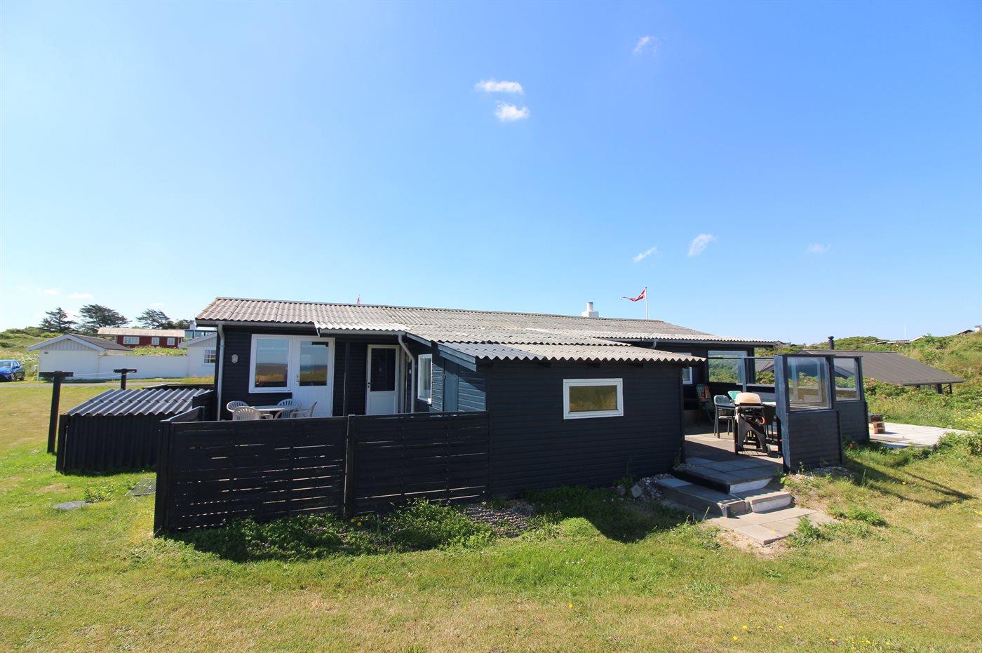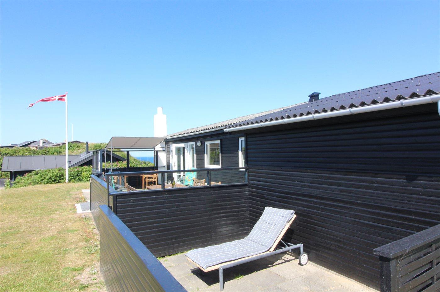 Højtbeliggende og rummeligt sommerhus med udsigt til Vesterhavet og området fra såvel hus som grund. Huset ligger i et kuperet område nær vandet på en åben grund delvist omgivet af klitter og hybenroser.