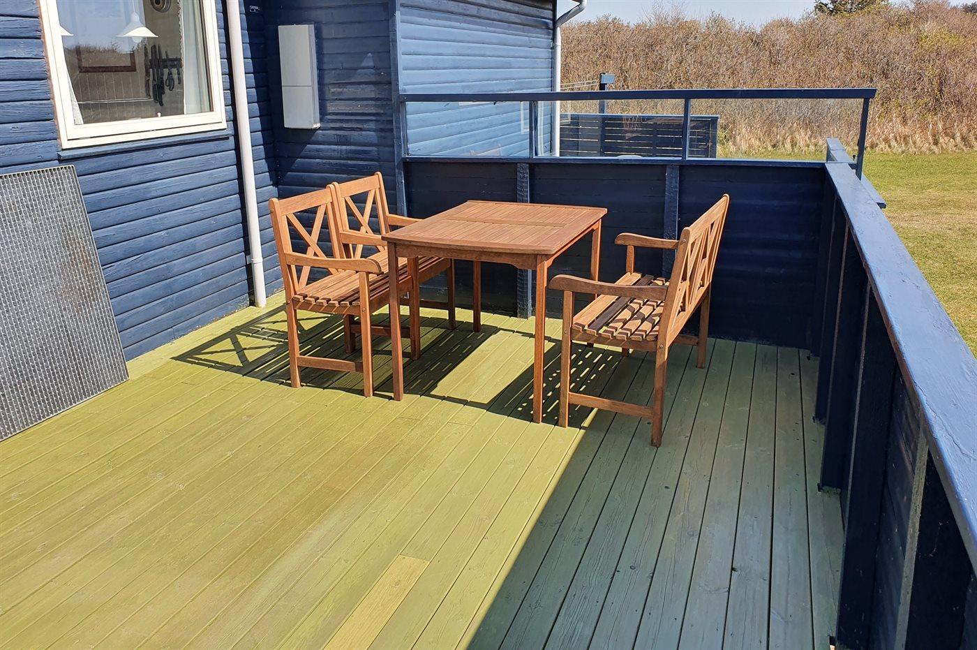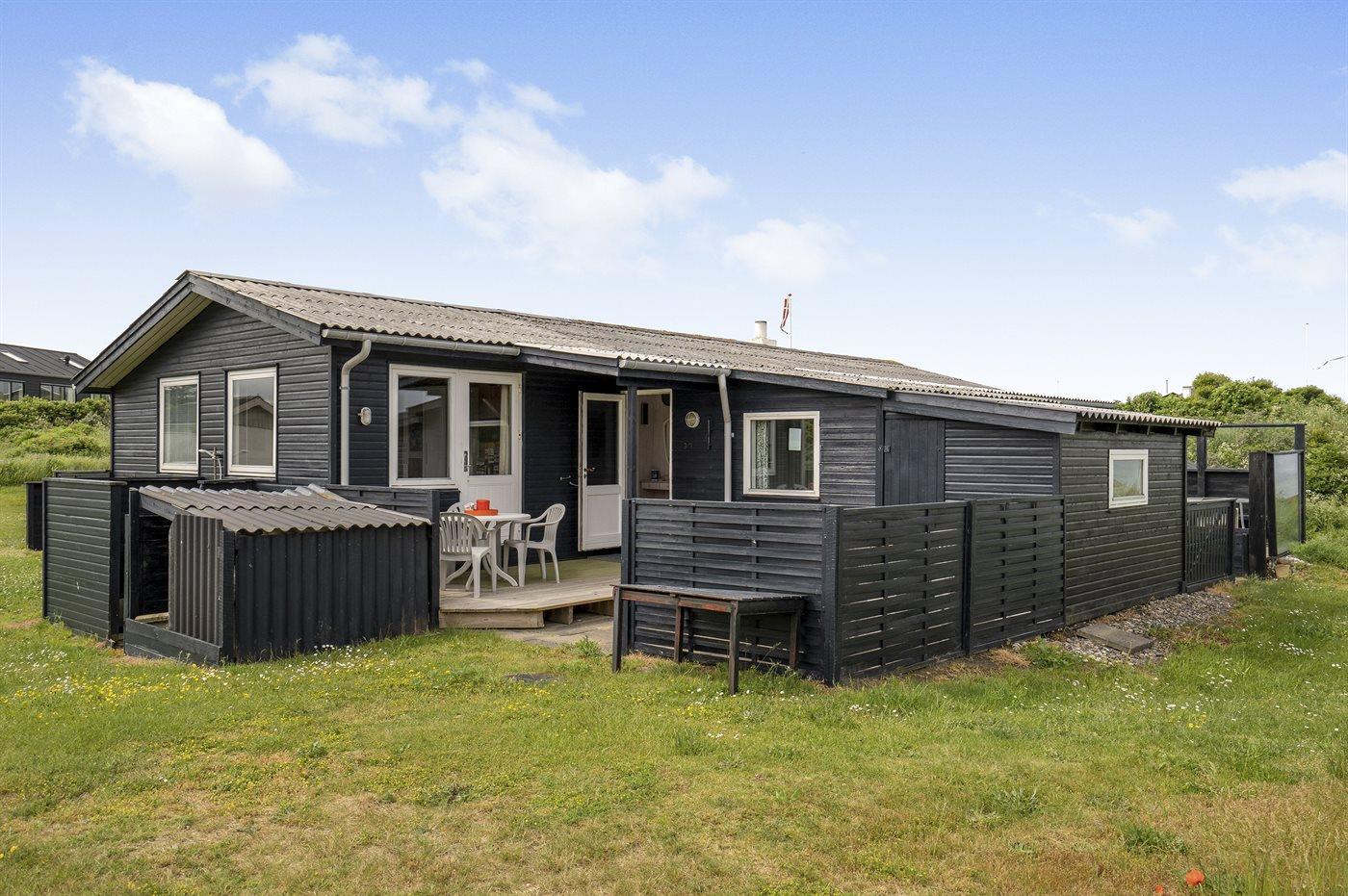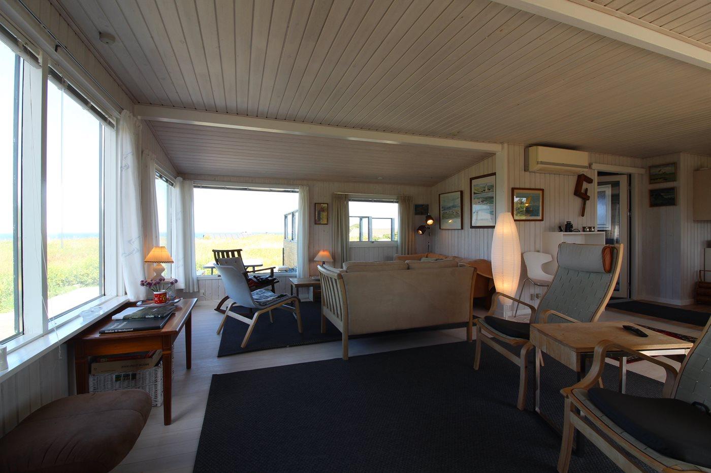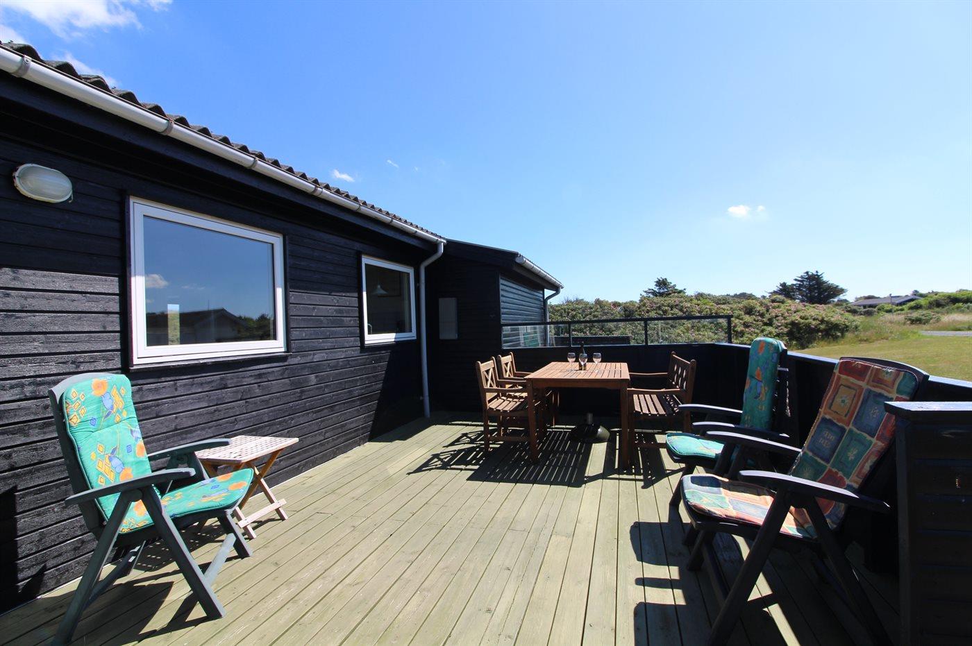 Højtbeliggende og rummeligt sommerhus med udsigt til Vesterhavet og området fra såvel hus som grund. Huset ligger i et kuperet område nær vandet på en åben grund delvist omgivet af klitter og hybenroser.
