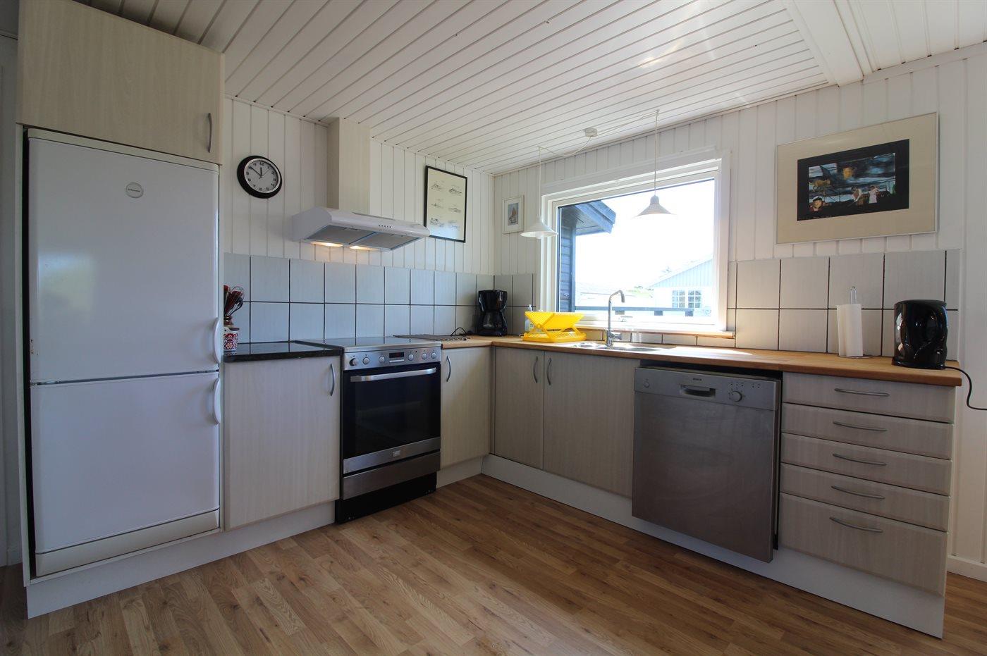 Køkkenet er udstyret med 1 køleskab. Der er 4 keramiske kogeplader, varmluftovn, mikrobølgeovn samt opvaskemaskine.