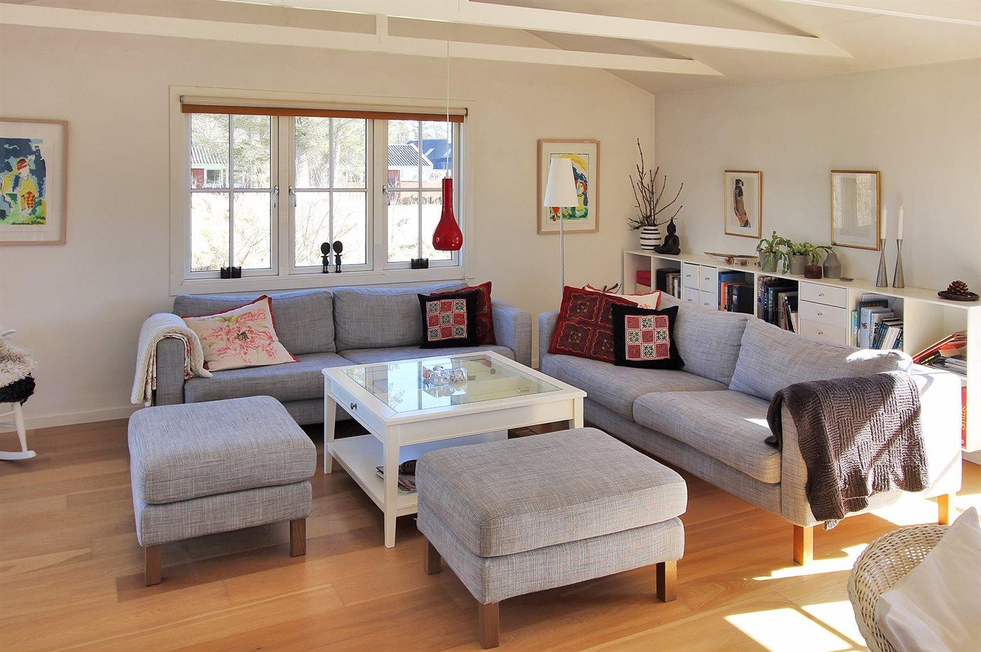 Hyggeligt og rummeligt sommerhus beliggende for enden af blind vej, på en delvis lukket grund, med skønne terrassearealer på flere sider af huset.