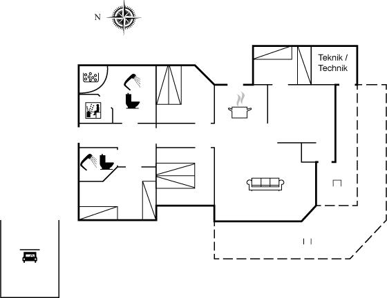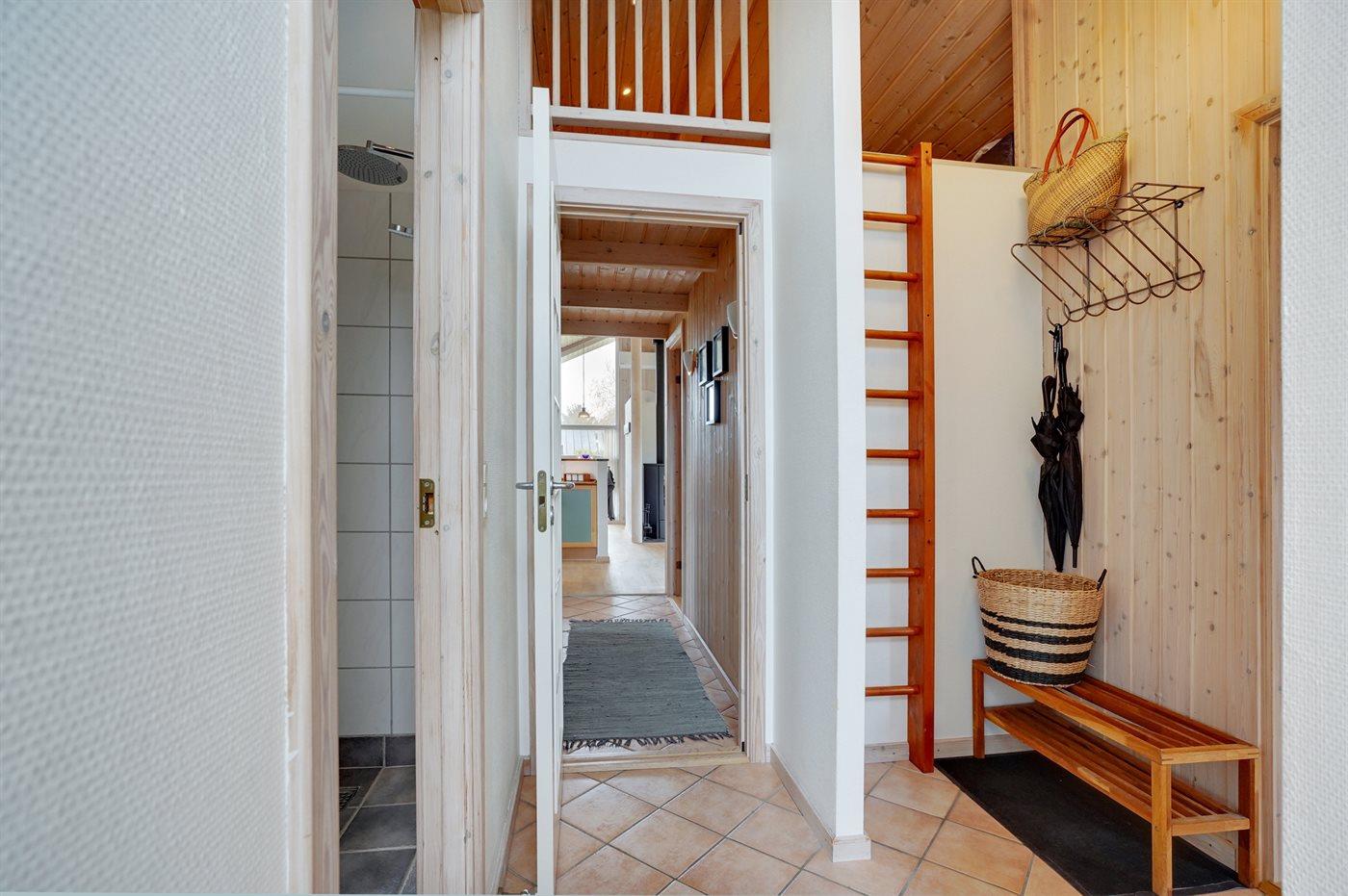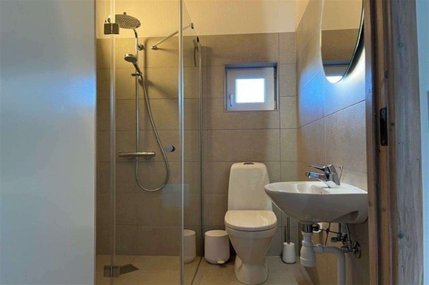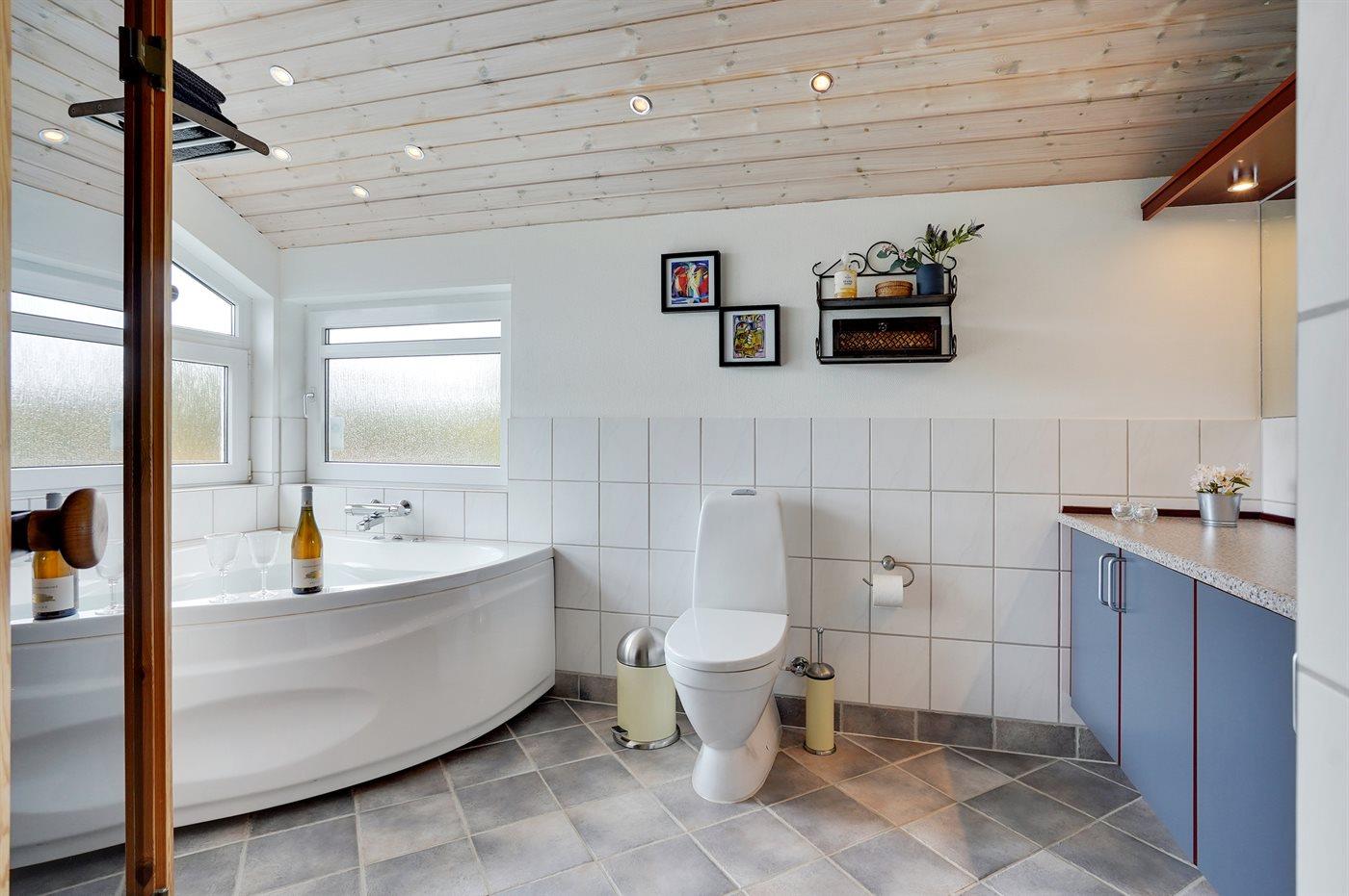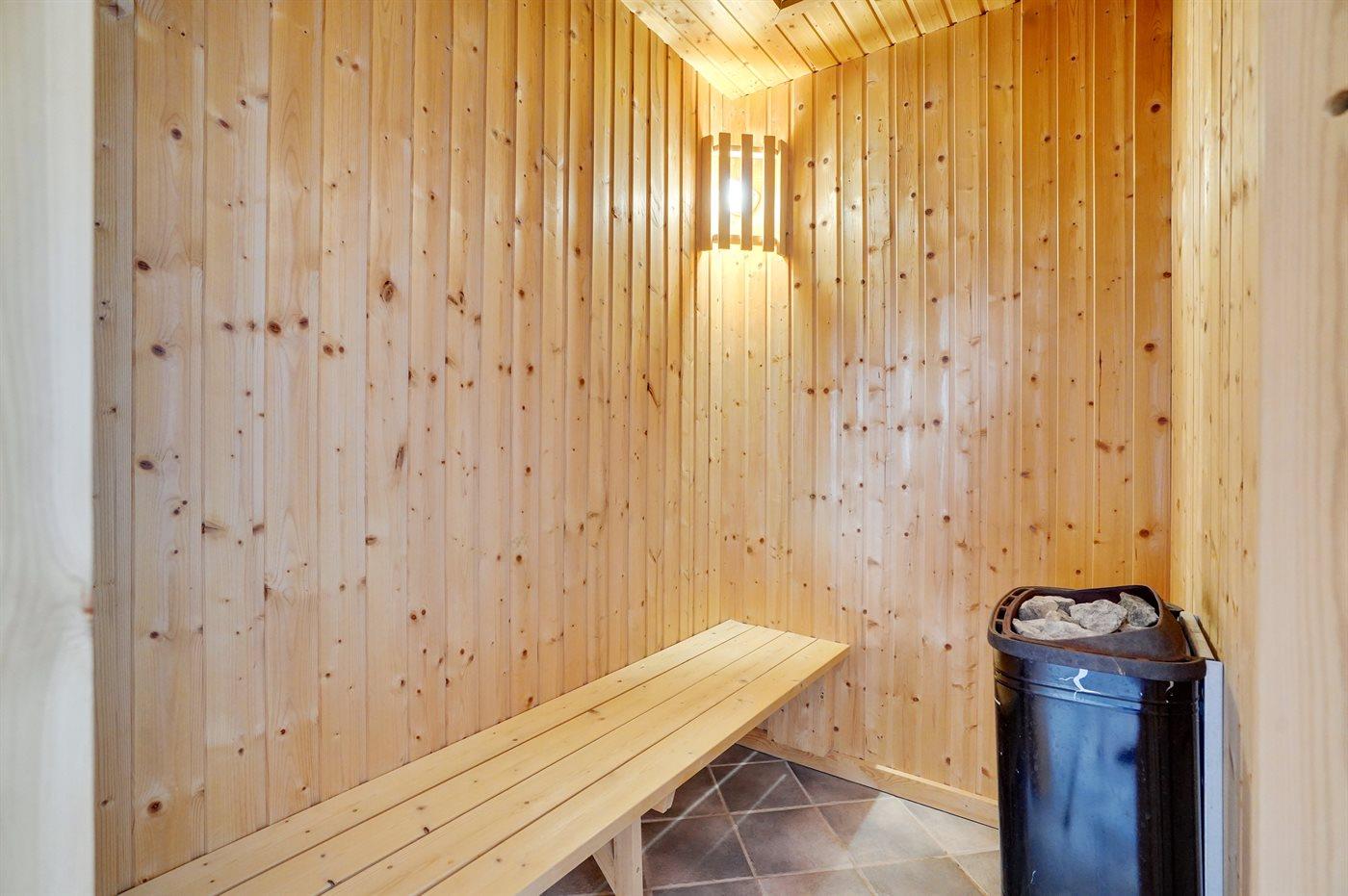 Der er 2 badeværelser med bruseniche og 2 toiletter. Der er gulvvarme på 2 badeværelser. I saunaen er der mulighed for afslapning.