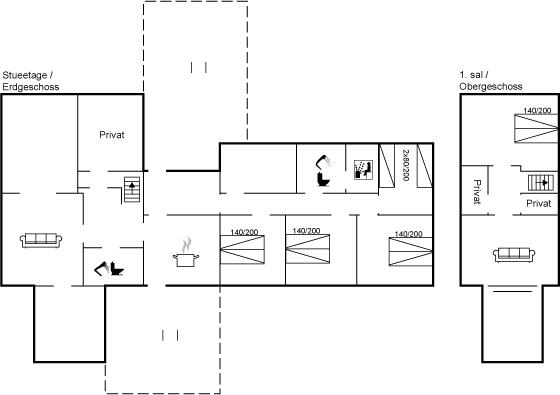 Der er i alt 5 soveværelser. Sovepladserne fordeler sig på: 8 sovepladser i dobbeltsenge. 2 sovepladser i enkeltsenge.