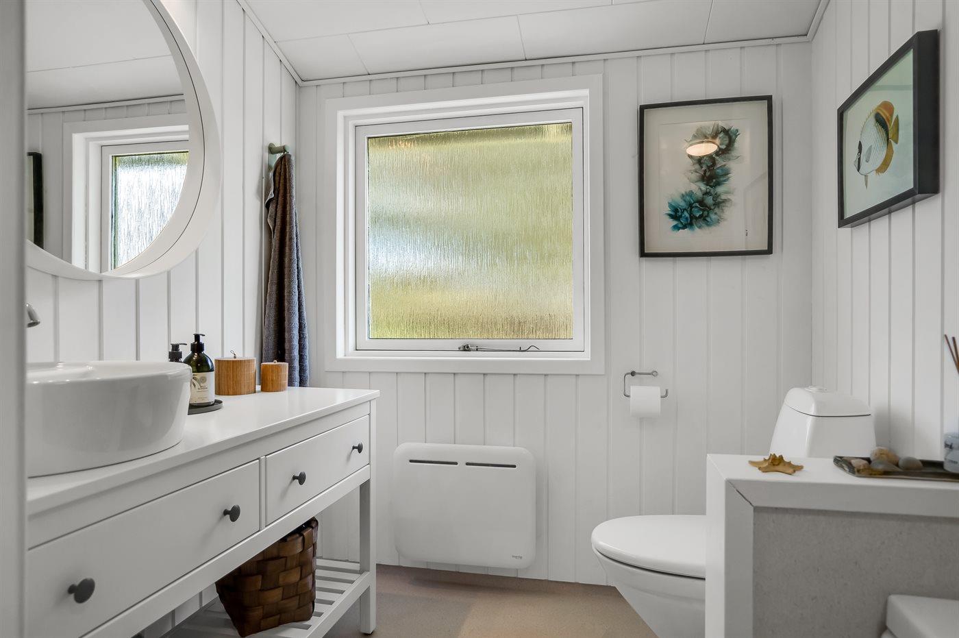Der er 1 badeværelse med bruseniche, sauna og spa. 2 toiletter, heraf 1 gæstetoilet