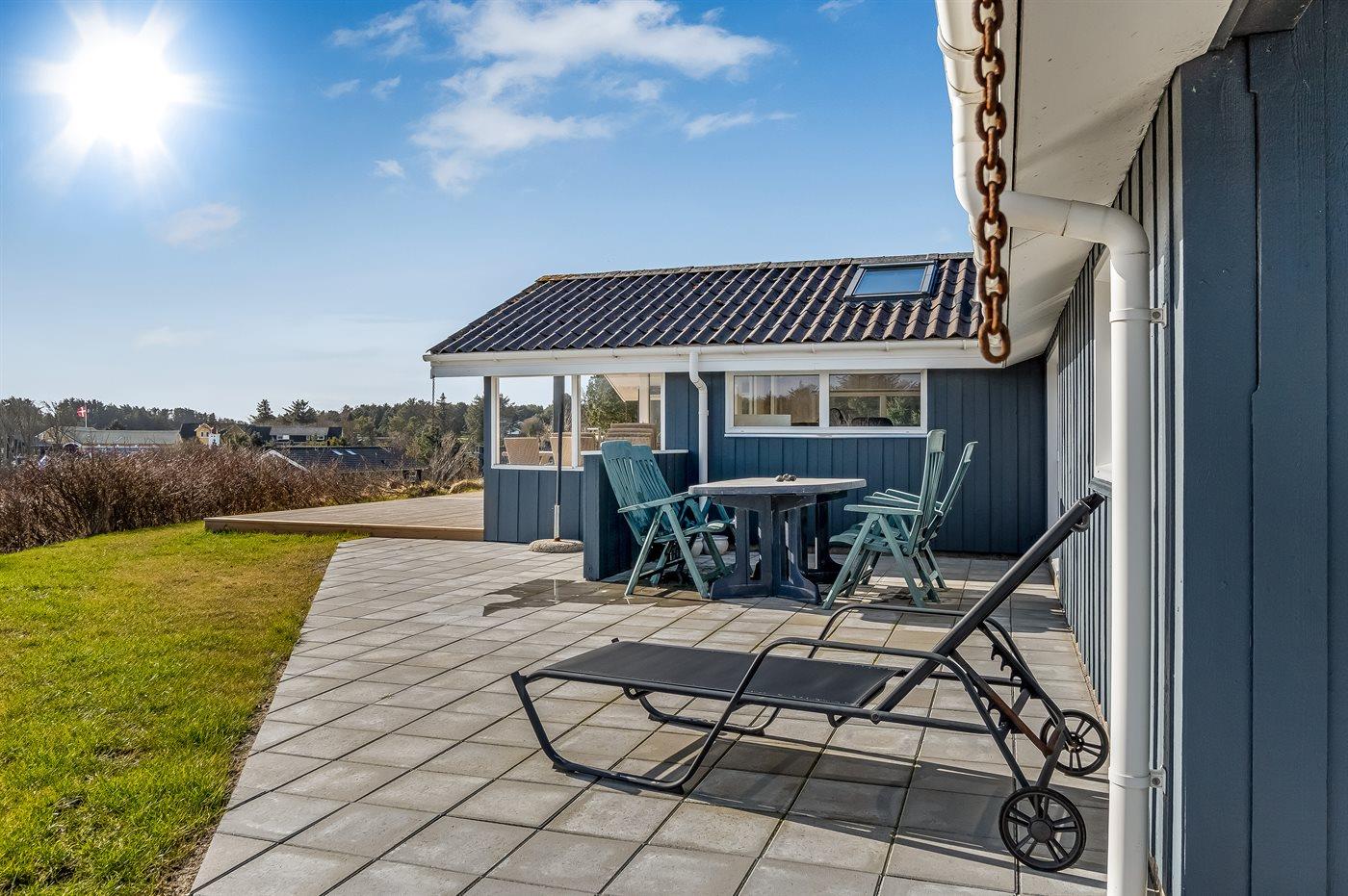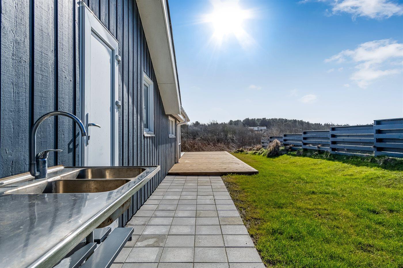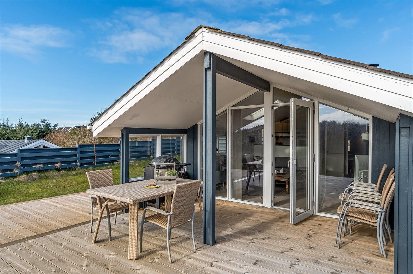 Der er store og gode terrasseforhold og specielt den overdækkede i forlængelse af stuen gør opholdet dejligt. På vestsiden findes bord med vask, hvor den nyfangede fisk kan tilberedes.