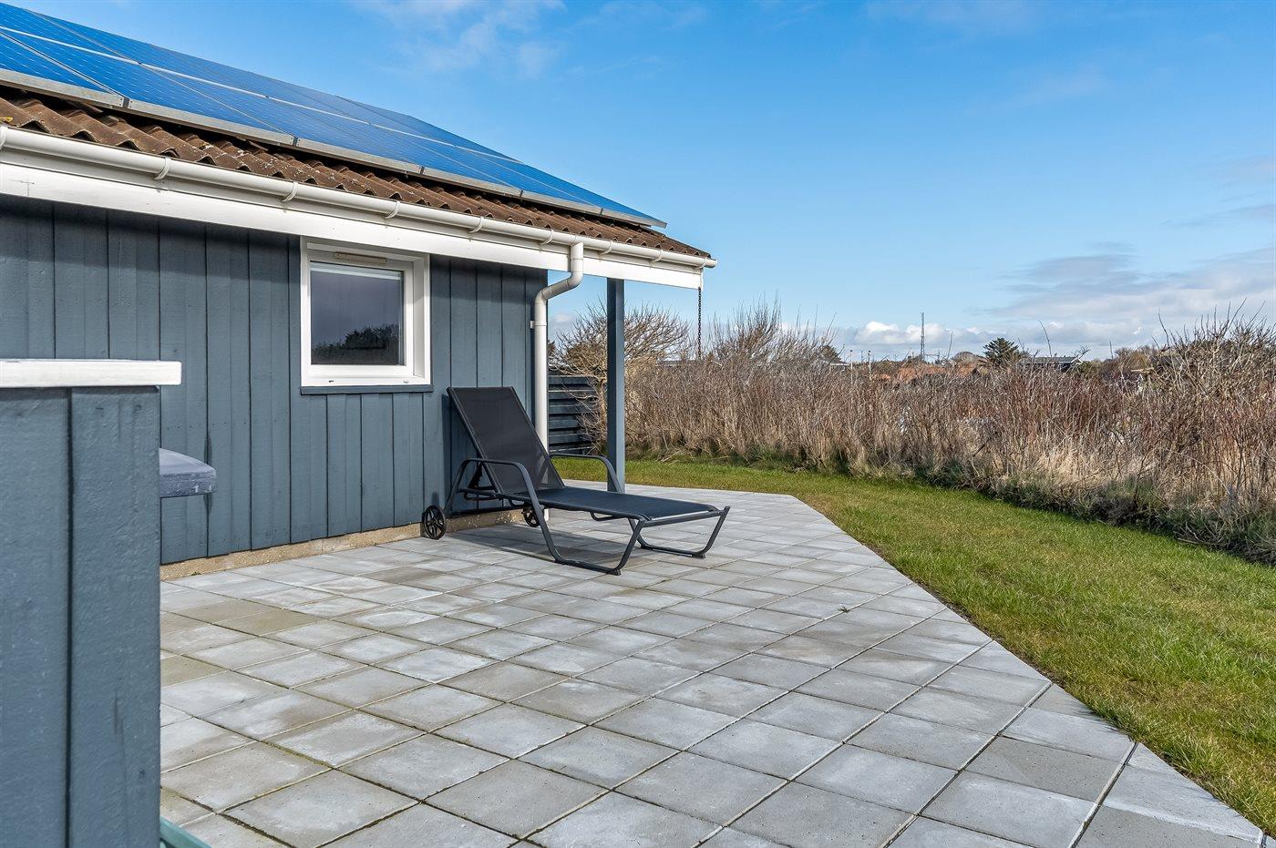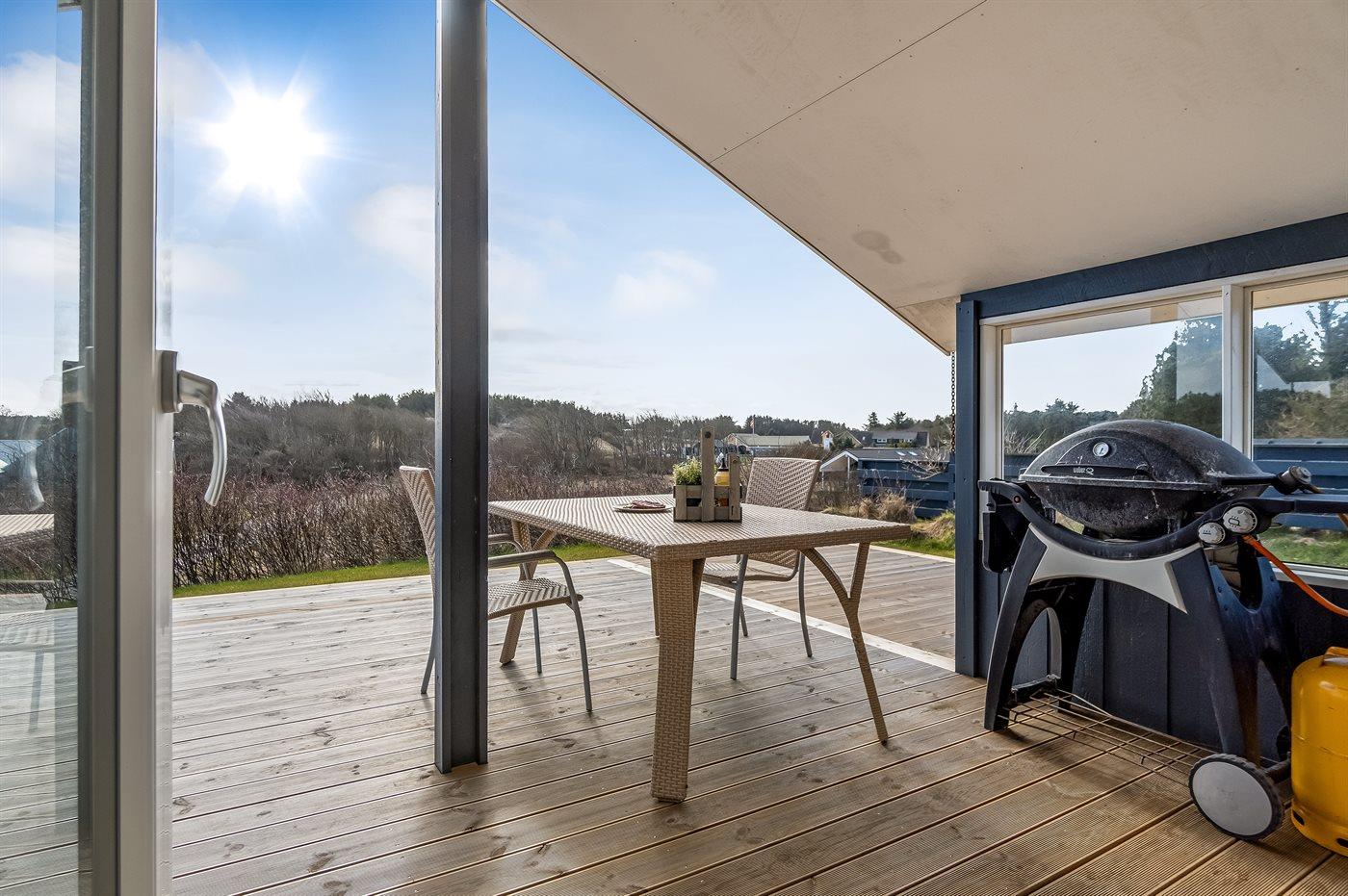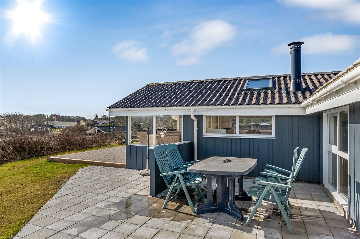 Der er store og gode terrasseforhold og specielt den overdækkede i forlængelse af stuen gør opholdet dejligt. På vestsiden findes bord med vask, hvor den nyfangede fisk kan tilberedes.