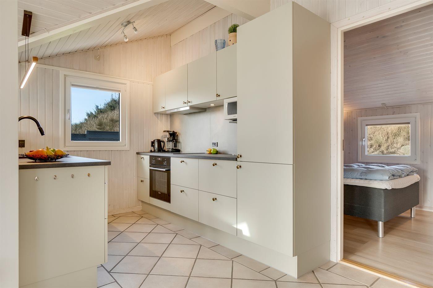 Køkkenet er udstyret med 1 køleskab. Der er 4 elkogeplader, bageovn, mikrobølgeovn samt opvaskemaskine Der er gulvvarme i køkkenet.