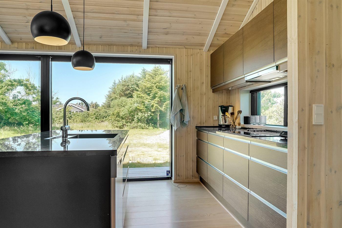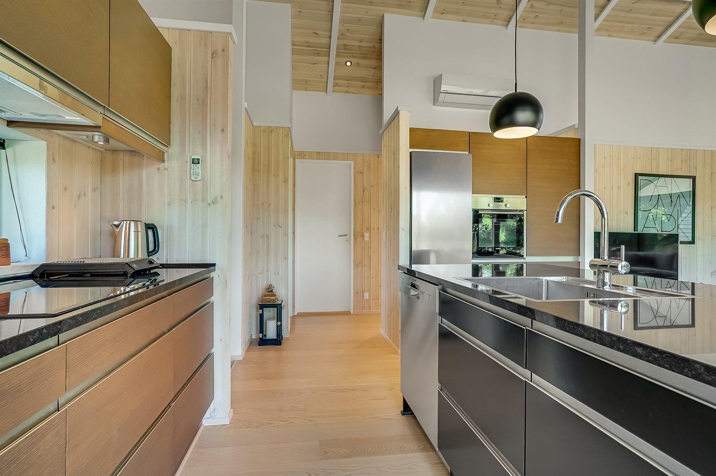 Køkkenet er udstyret med 1 køleskab. Der er 4 induktionskogeplader, varmluftovn, mikrobølgeovn samt opvaskemaskine.