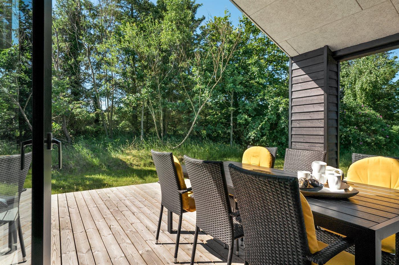 Ferieboligen er beliggende på en 1150 m² stor naturgrund. Der er 561 m til havet. Nærmeste forretning er beliggende i en afstand af 500 m. Til ferieboligen hører 17 m² terrasseareal. Desuden er der 10 m² overdækket terrasse. Der er redskabsrum. Der er carport til rådighed. Parkering ved ferieboligen.