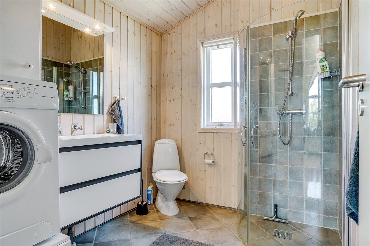 Der er 1 badeværelse med bruseniche og 1 toilet.. Der er gulvvarme på 1 badeværelse. I saunaen er der mulighed for afslapning.