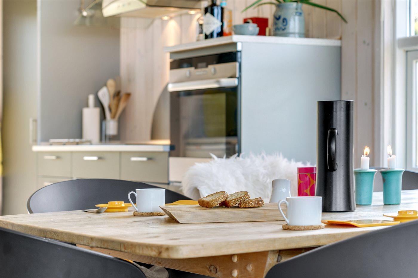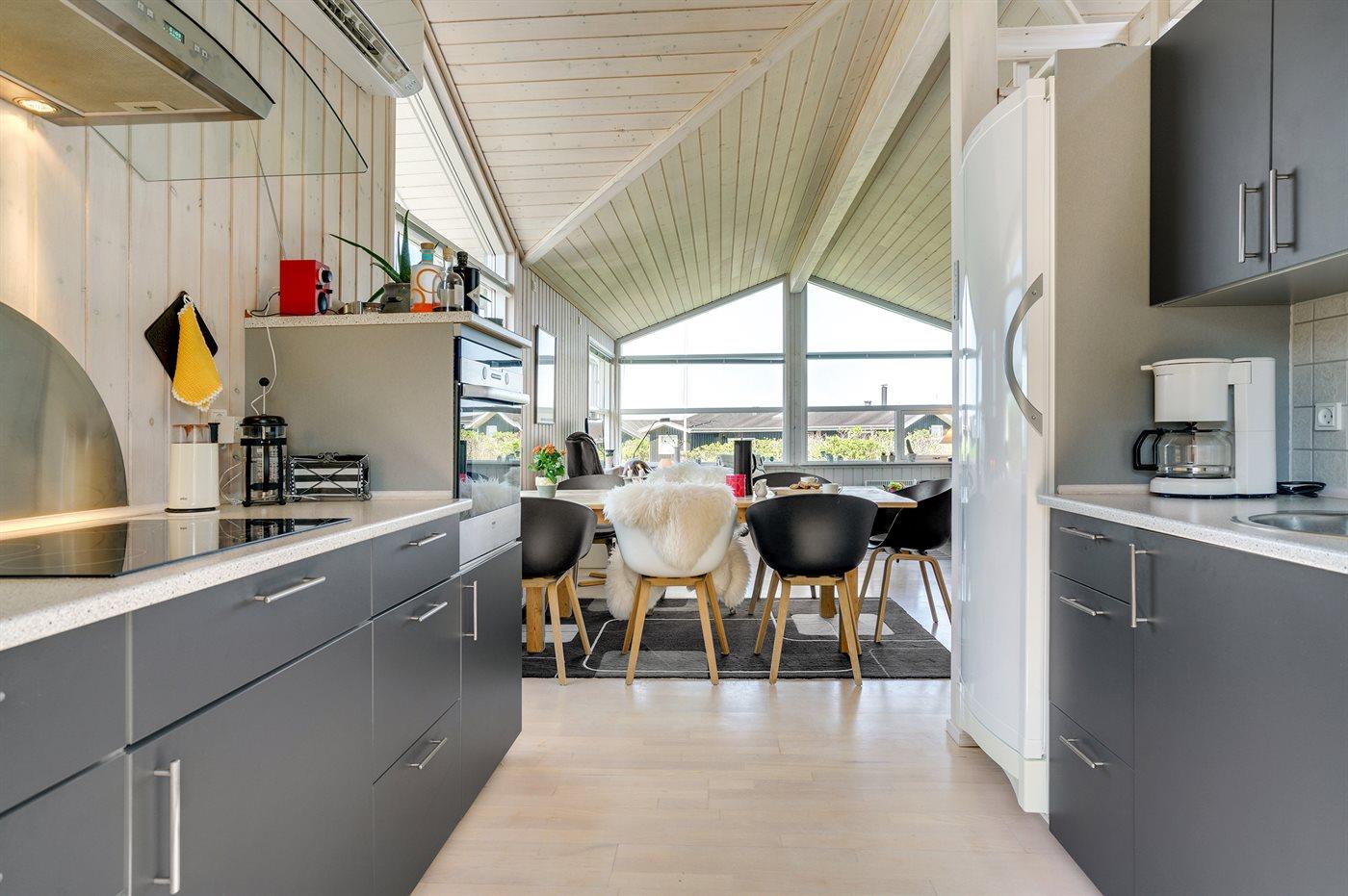 Køkkenet er udstyret med 1 køleskab. Der er 4 induktionskogeplader, varmluftovn, mikrobølgeovn samt opvaskemaskine.
