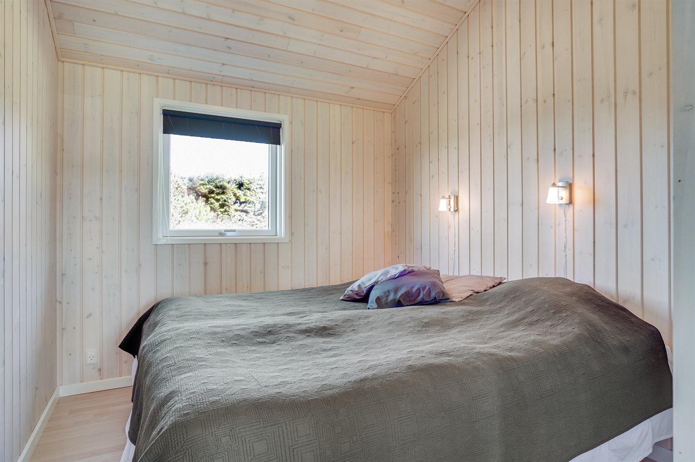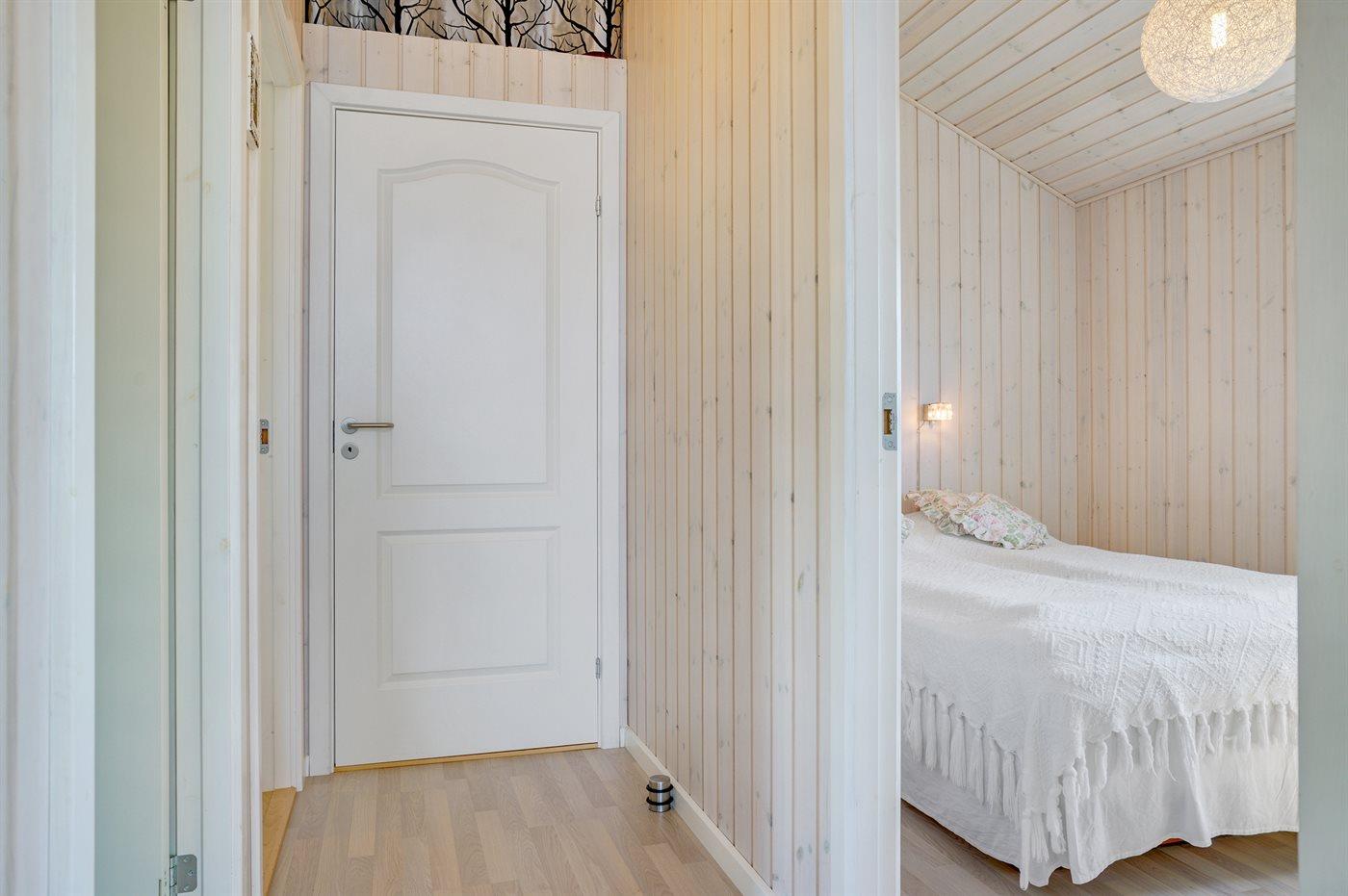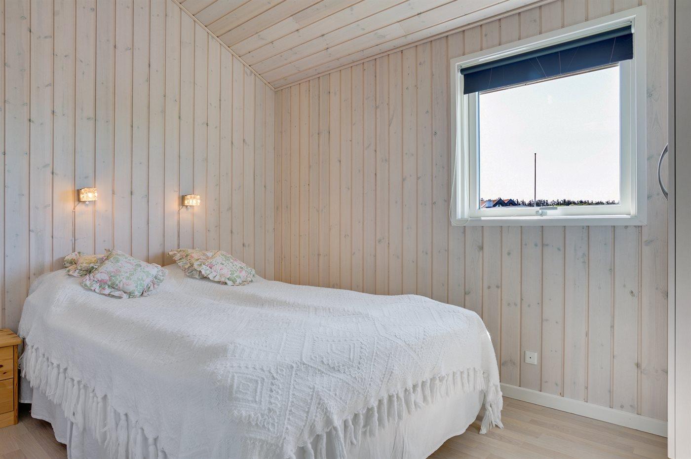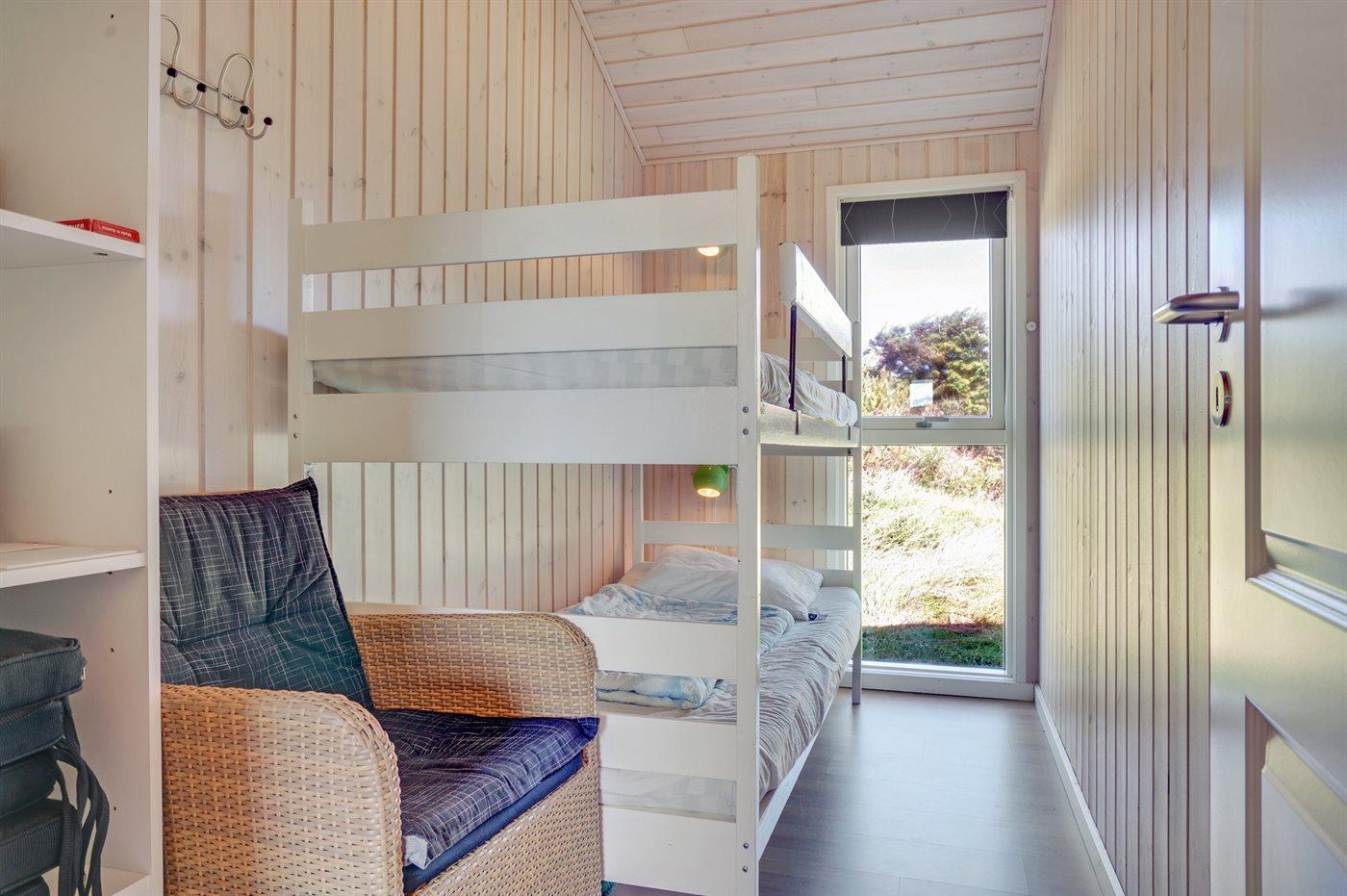 Der er i alt 3 soveværelser. Sovepladserne fordeler sig på: 2 sovepladser i dobbeltseng. 2 sovepladser i køjeseng.2 sovepladser i elevationssenge. Derudover er der 1 stk. barneseng.