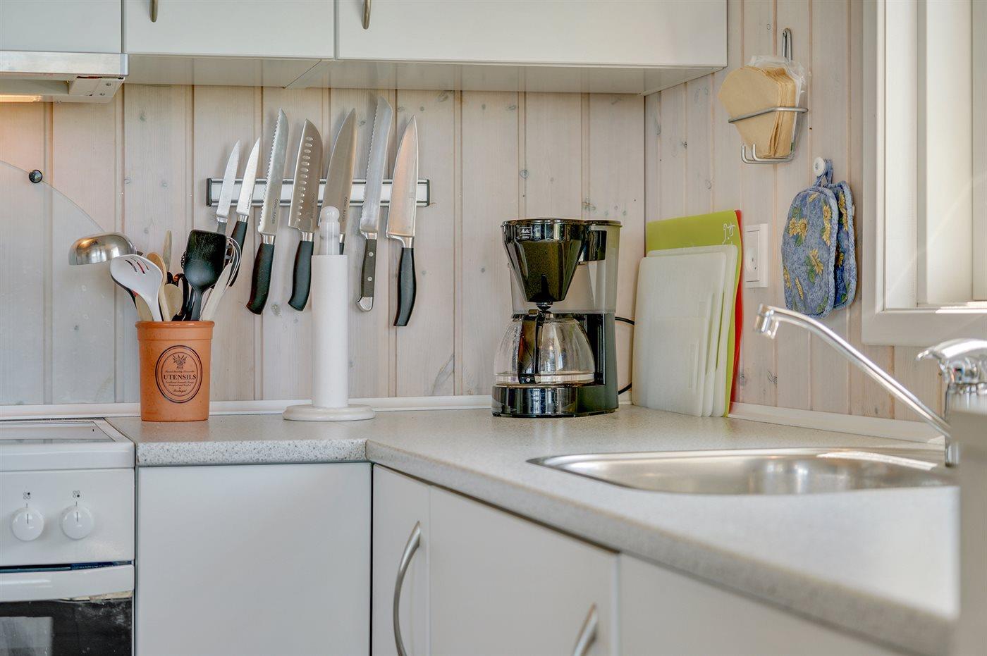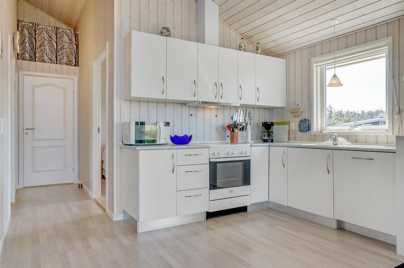 Køkkenet er udstyret med 1 køleskab. Der er 4 keramiske kogeplader, varmluftovn, mikrobølgeovn samt opvaskemaskine.