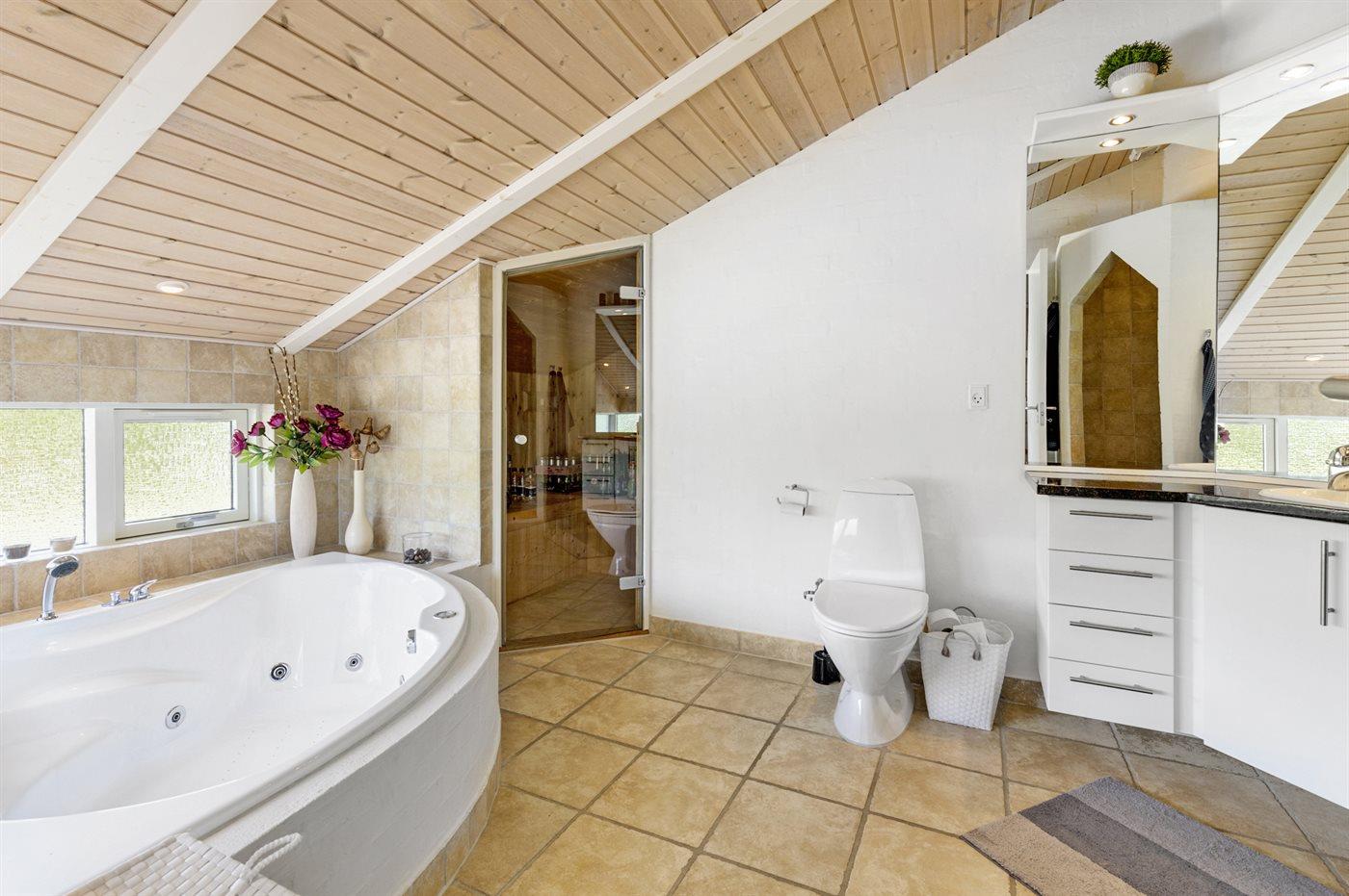 Der er 2 badeværelser med bruseniche og 2 toiletter. Der er gulvvarme på 2 badeværelser. I saunaen er der mulighed for afslapning.