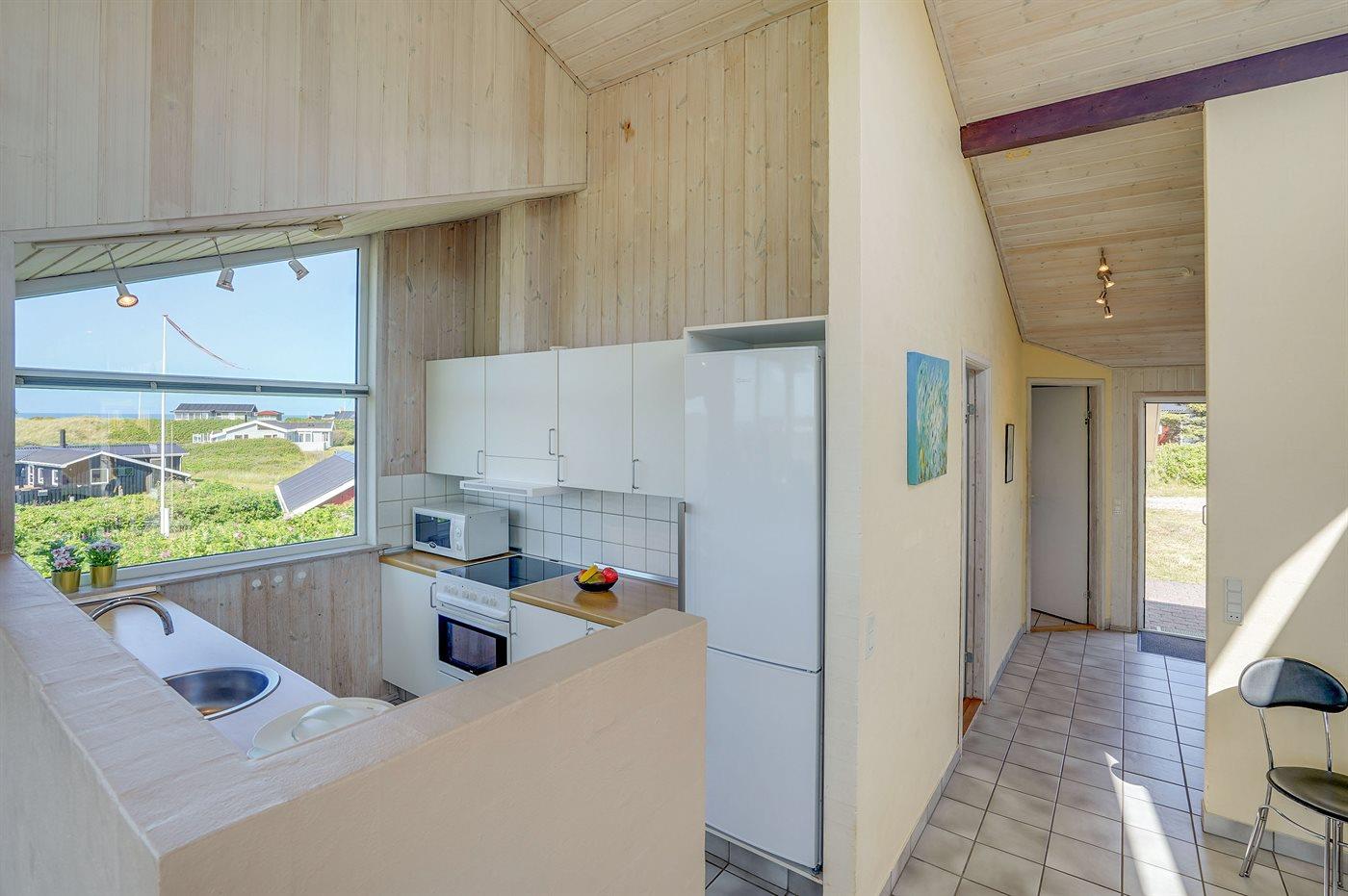 Køkkenet er udstyret med 1 køleskab. Der er 4 keramiske kogeplader, varmluftovn, mikrobølgeovn samt opvaskemaskine.