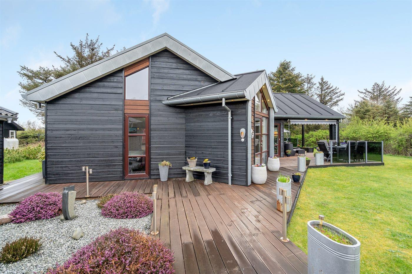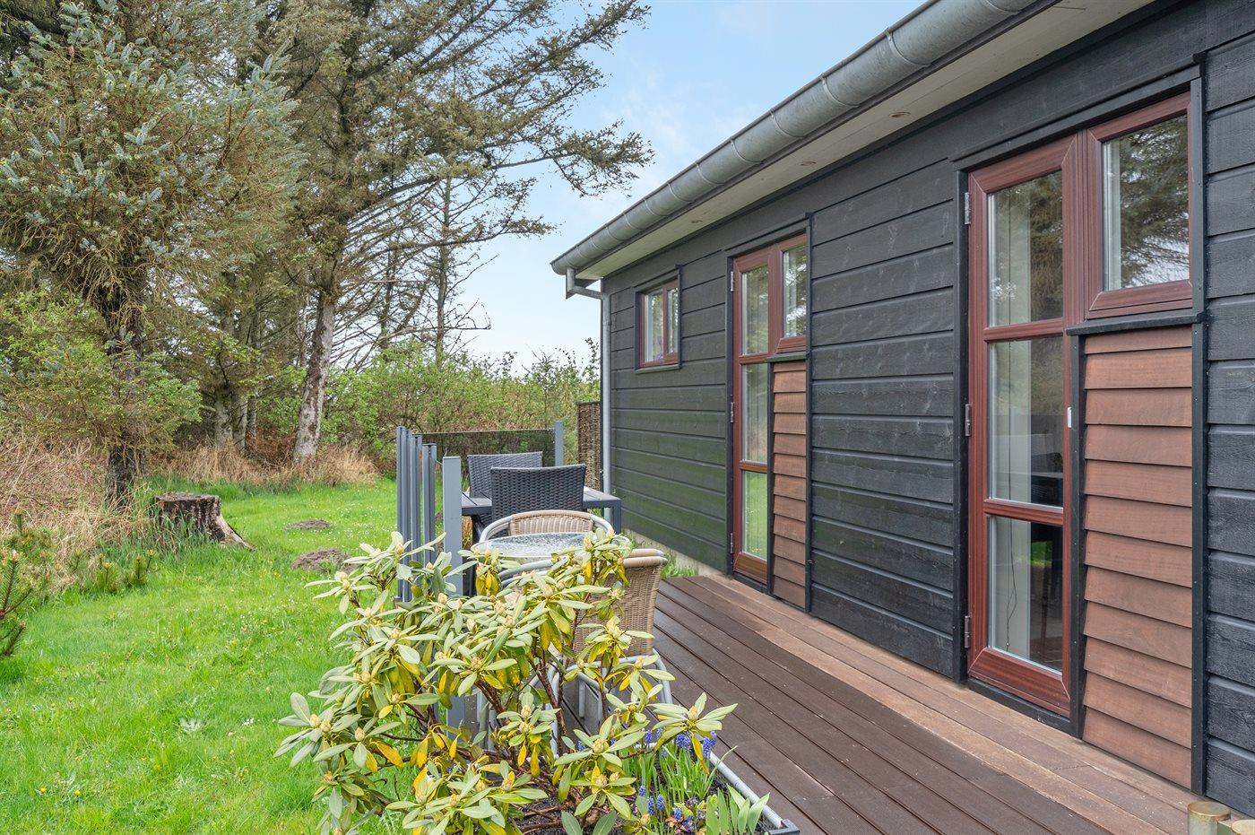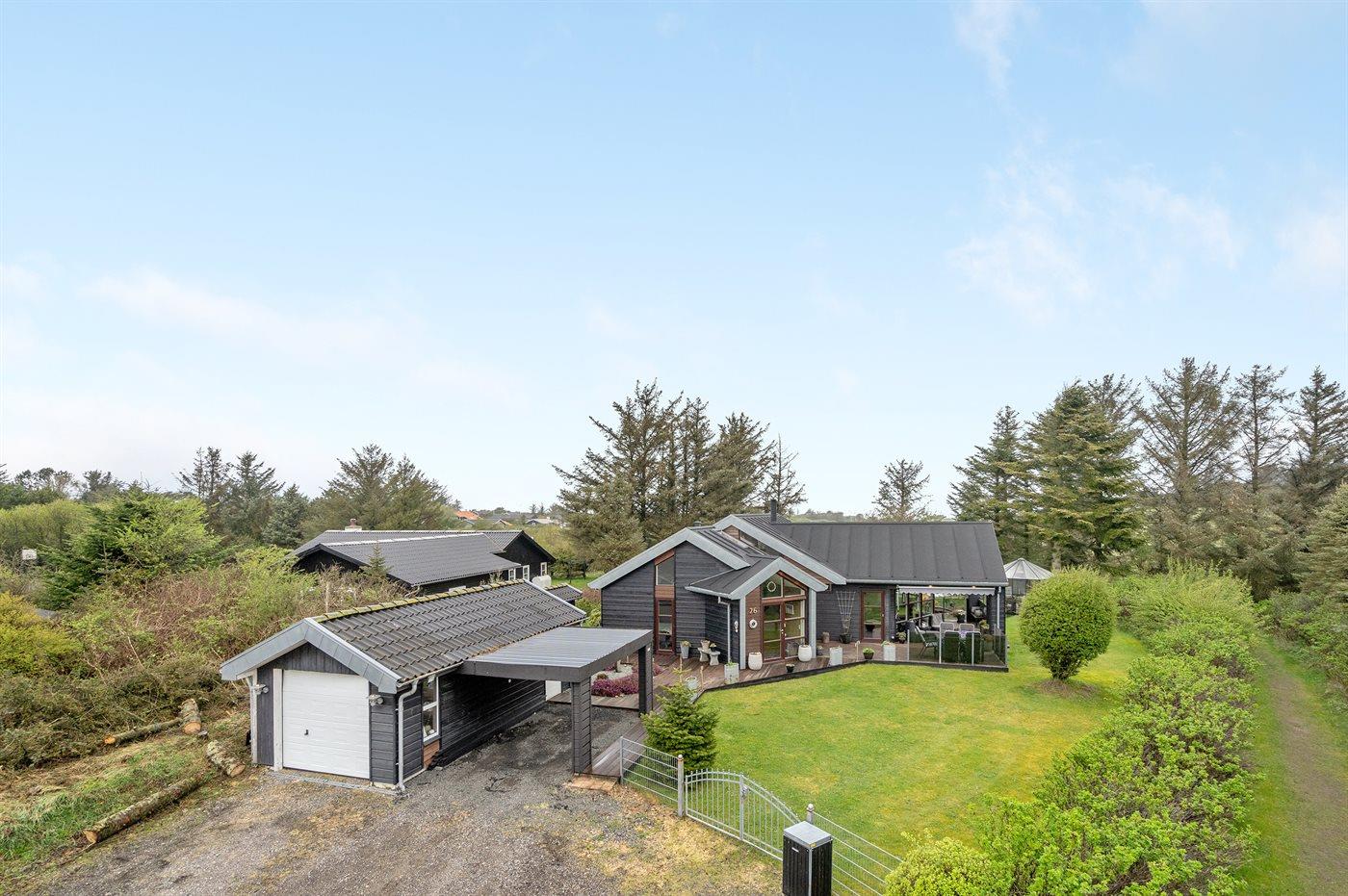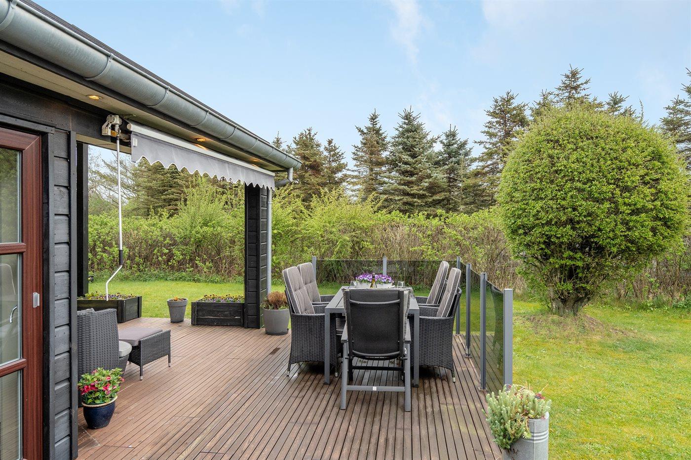 Ferieboligen er beliggende på en 1100 m² stor havegrund. Der er 700 m til havet. Nærmeste forretning er beliggende i en afstand af 1000 m. Til ferieboligen hører 100 m² terrasseareal. Desuden er der 25 m² overdækket terrasse. Der er carport til rådighed. Parkering ved ferieboligen.