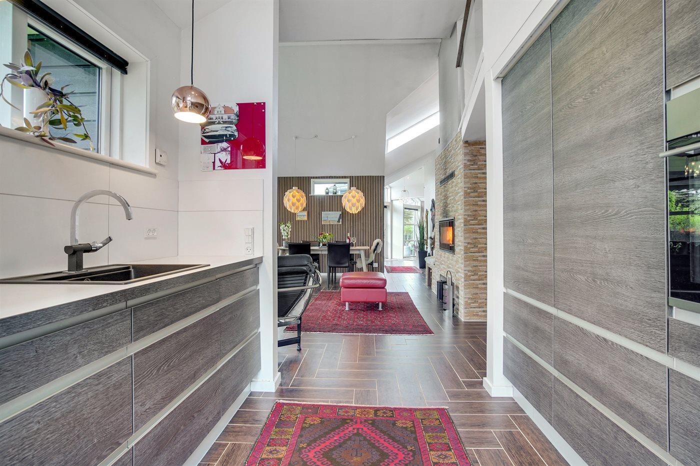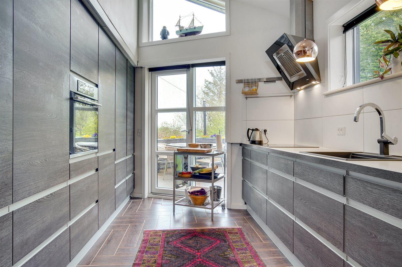 Køkkenet er udstyret med 1 køleskab. Der er 4 induktionskogeplader, varmluftovn samt opvaskemaskine.