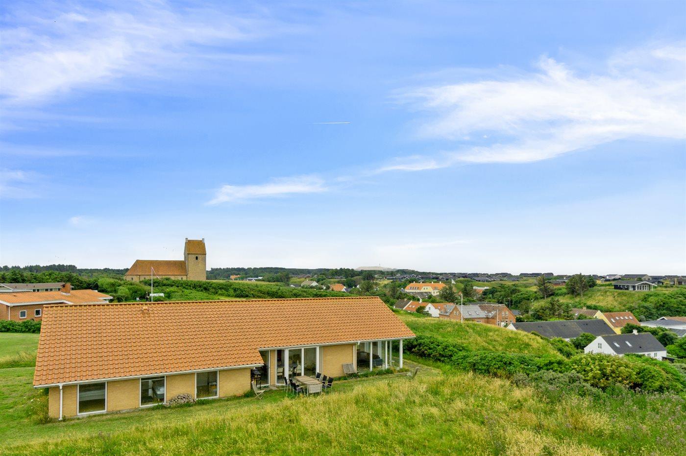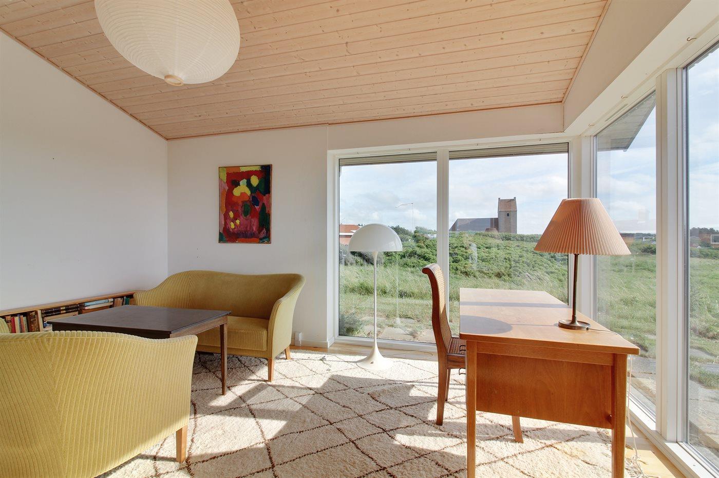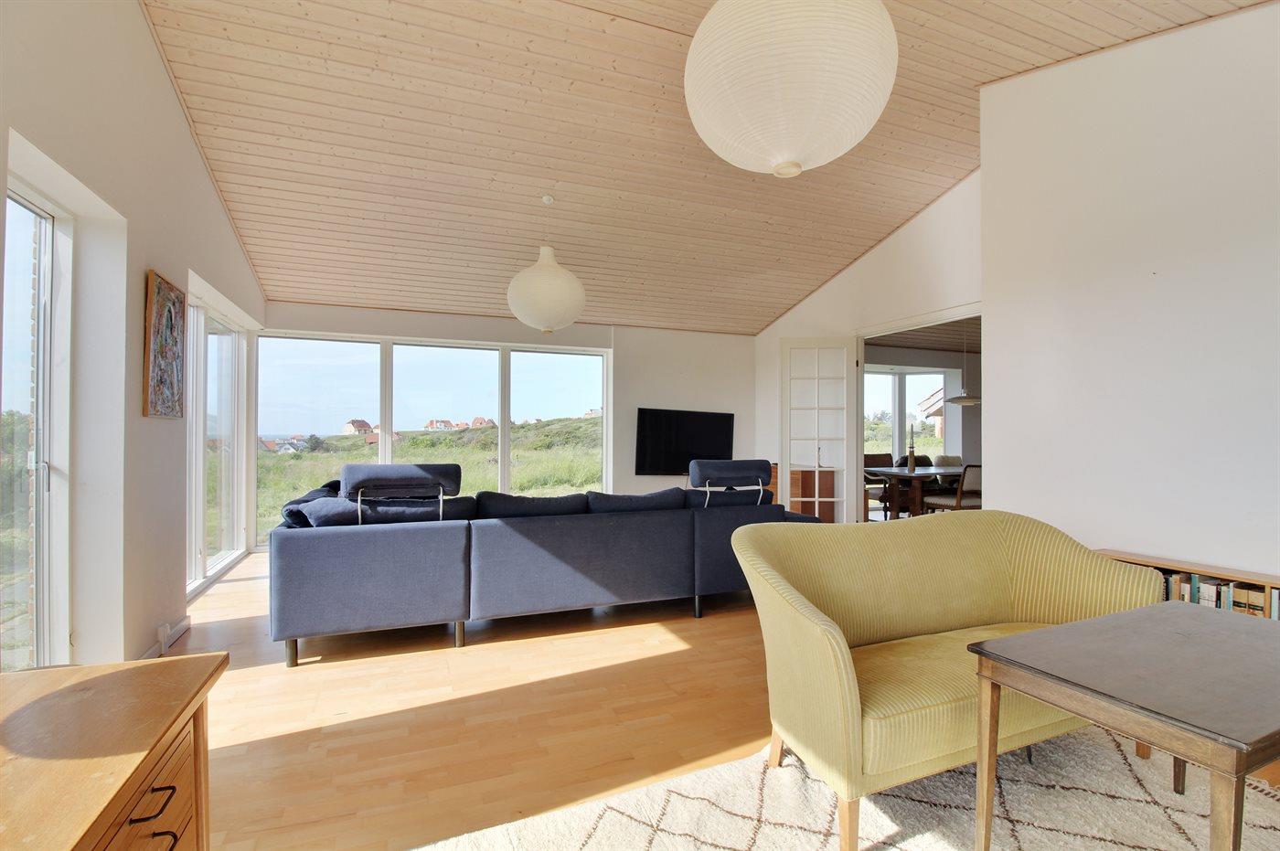 Højt beliggende sommerhus i Lønstrup med fantastisk udsigt både til Vesterhavet og til Rubjerg Knude. Her kan man nyde udsigten både fra terrassen og fra stuen.