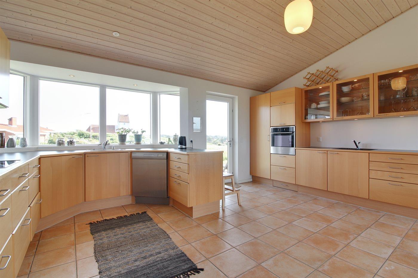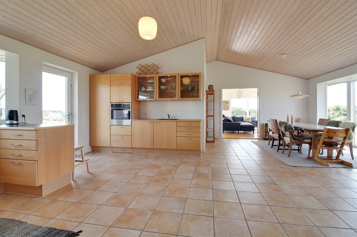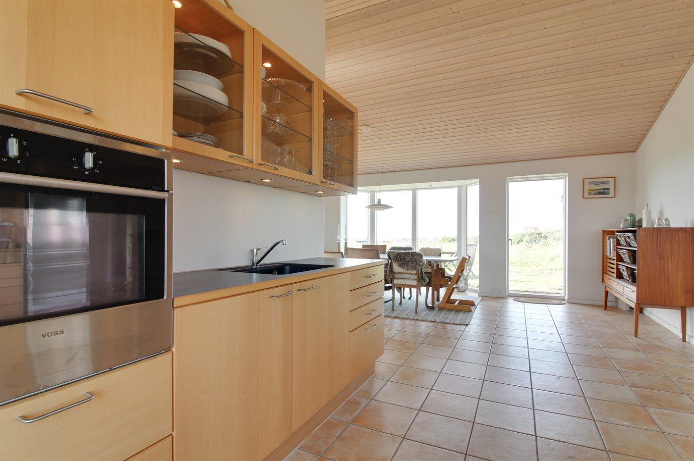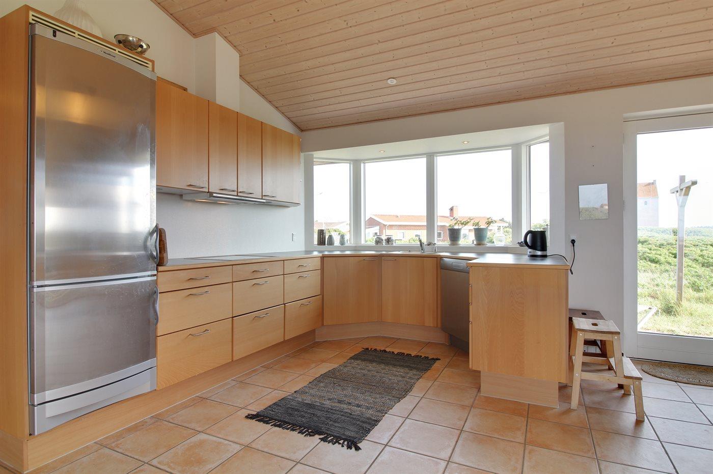 Køkkenet er udstyret med 1 køleskab. Der er 4 keramiske kogeplader, varmluftovn samt opvaskemaskine.
