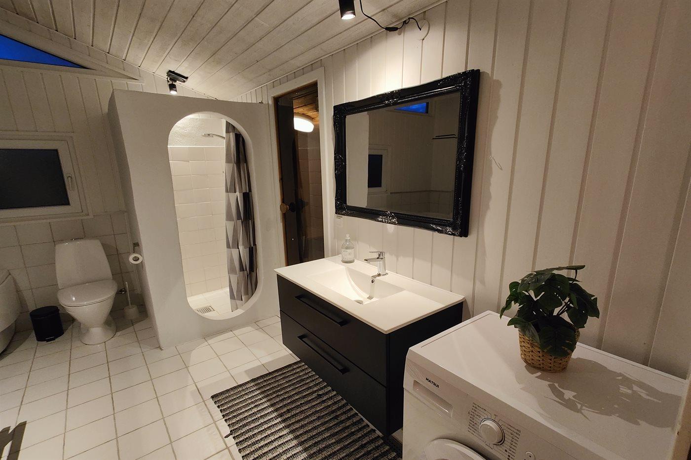 Der er 1 badeværelse med bruseniche og 2 toiletter, heraf 1 gæstetoilet. Der er gulvvarme på 1 badeværelse.. Badekar. I saunaen er der mulighed for afslapning.