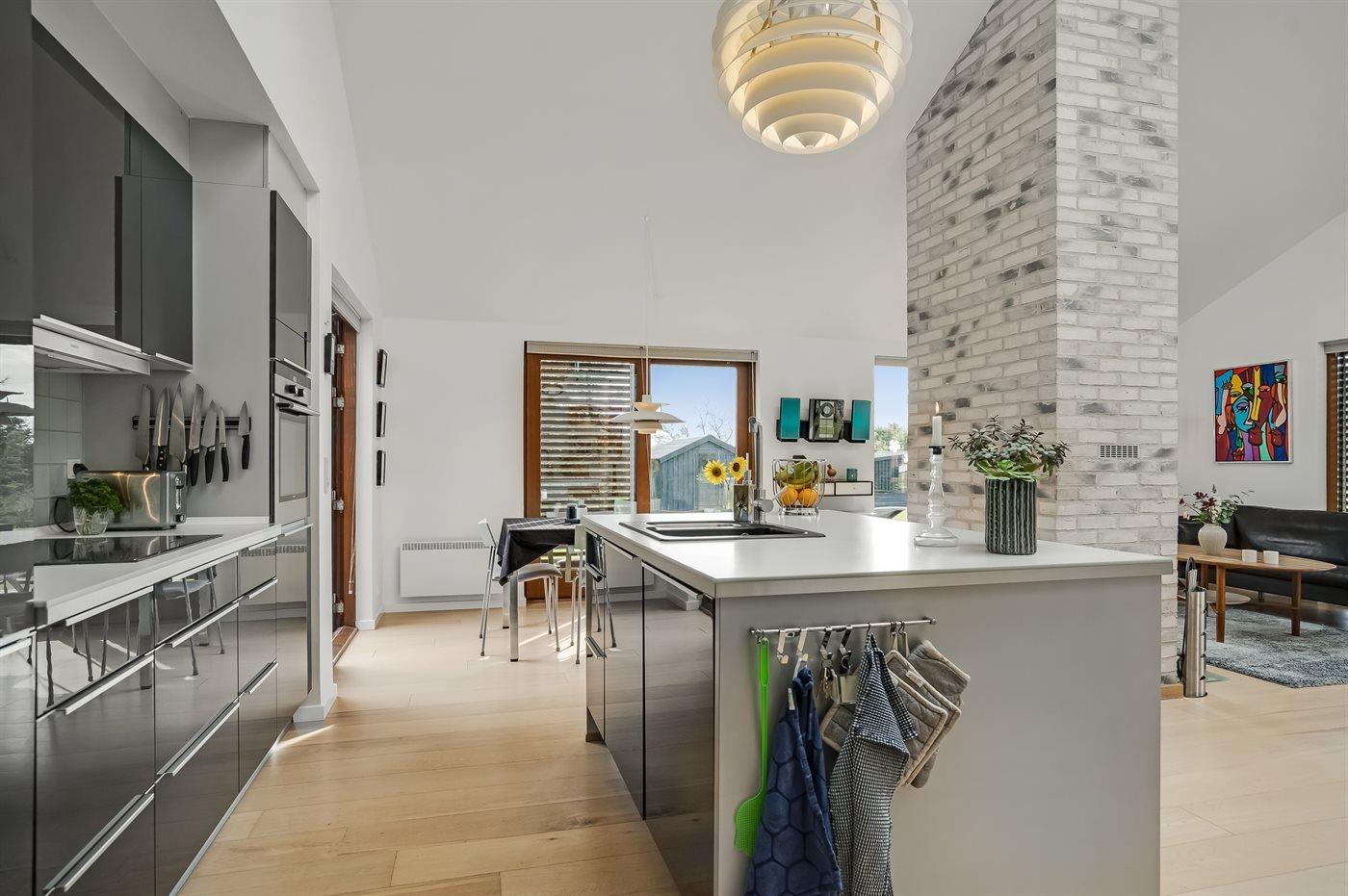 Køkkenet er udstyret med 1 køleskab. Der er 4 induktionskogeplader, varmluftovn, mikrobølgeovn samt opvaskemaskine.