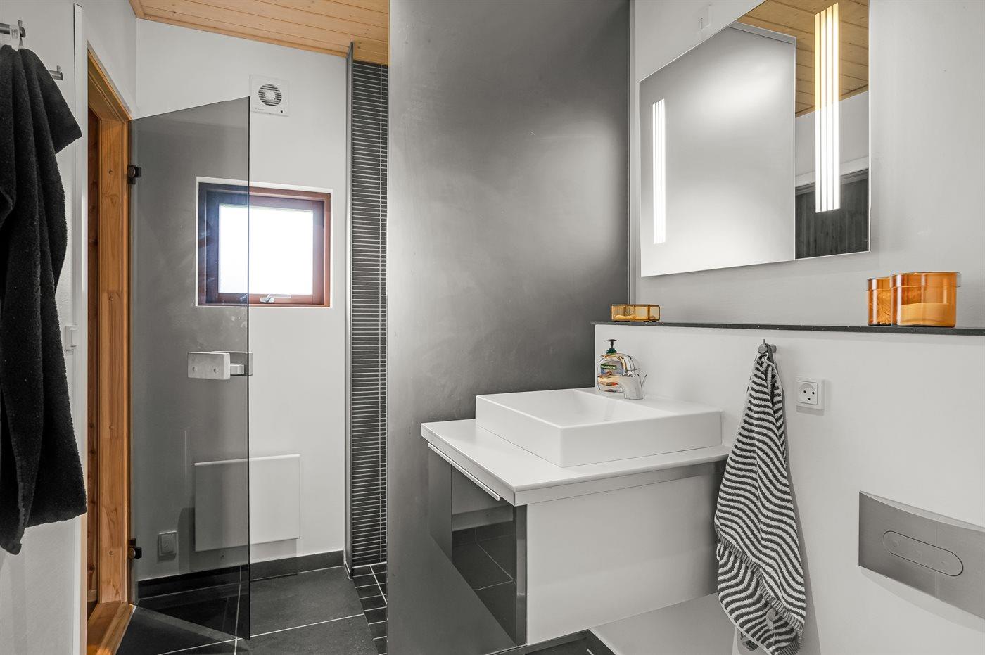Der er 2 badeværelser med bruseniche og 2 toiletter. Der er gulvvarme på 2 badeværelser. I saunaen er der mulighed for afslapning.
