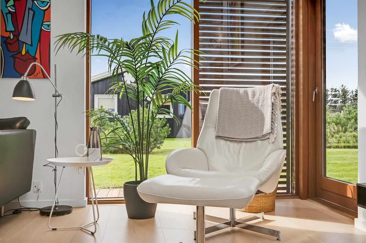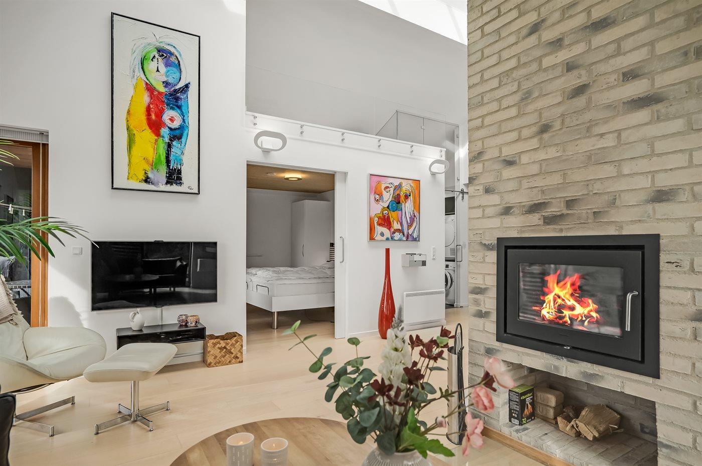 Indretningen er holdt i moderne stil med møbler i moderne design, B&O musikanlæg, gulve i egetræ samt vinduespartier fra gulv til loft - forsynet med justerbare skodder til justering af lysindfaldet. Stue og køkken/alrum er dekorativt adskilt af en skorsten og har brændeovn.
