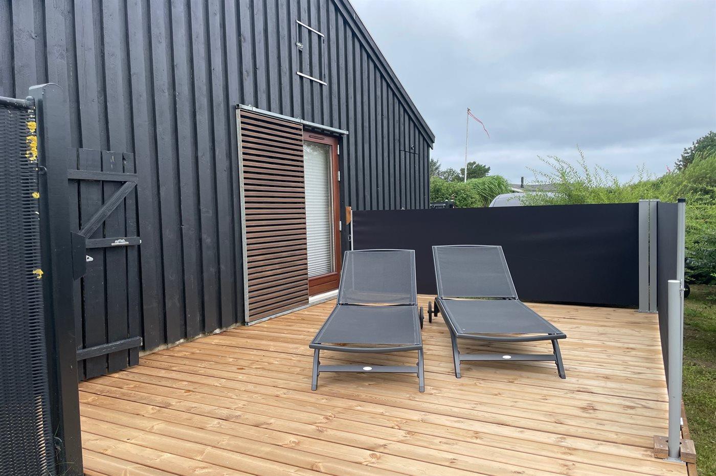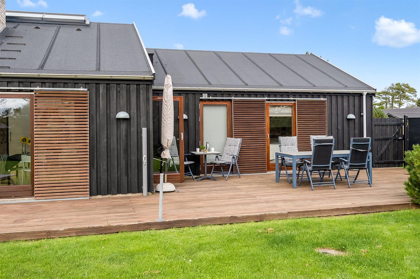 Ferieboligen er beliggende på en 1200 m² stor havegrund. Der er 758 m til havet. Nærmeste forretning er beliggende i en afstand af 300 m. Der er en golfbane i en afstand af 3000 m. Til ferieboligen hører åbent terrasseareal. Desuden er der overdækket terrasse. Der er redskabsrum. Der ligger en legeplads i en afstand af 300 m. Grill til rådighed. Der er installeret stik til opladning af elbil. Type 2 stik. Med 11 kW ladeeffekt. Parkering ved ferieboligen.