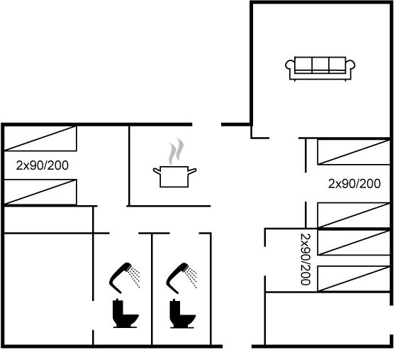 Der er i alt 3 soveværelser. Sovepladserne fordeler sig på: 6 sovepladser i enkeltsenge. 2 sovepladser på madrasser. 2 af disse sovepladser befinder sig på husets hems.