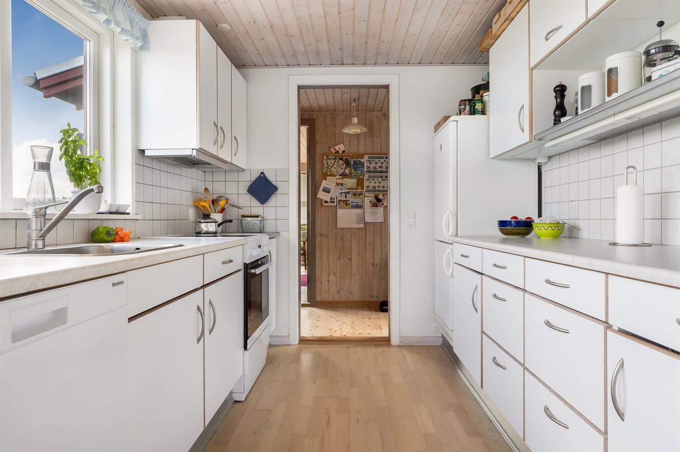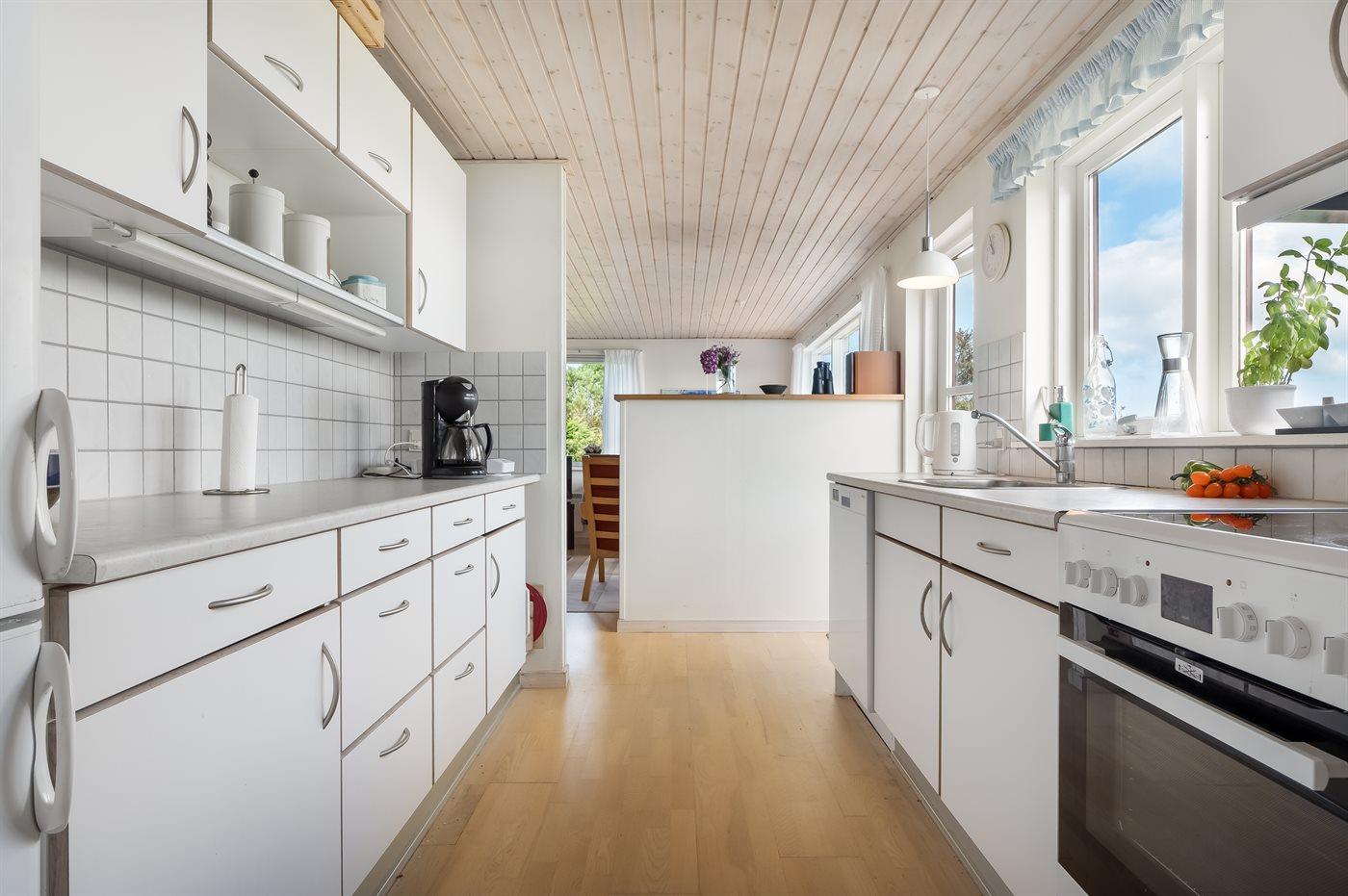 Køkkenet er udstyret med 1 køleskab. Der er 4 keramiske kogeplader, varmluftovn samt opvaskemaskine.
