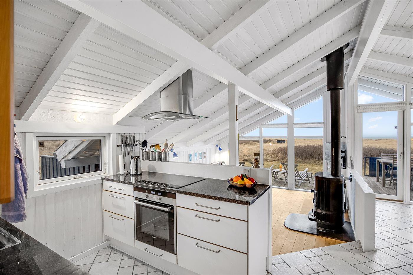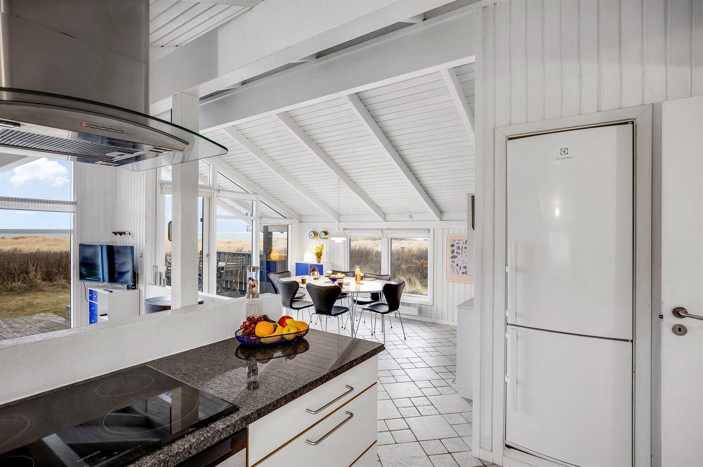 Køkkenet er udstyret med 1 køleskab. Der er 4 keramiske kogeplader, varmluftovn, mikrobølgeovn samt opvaskemaskine.