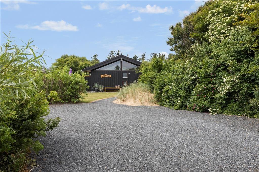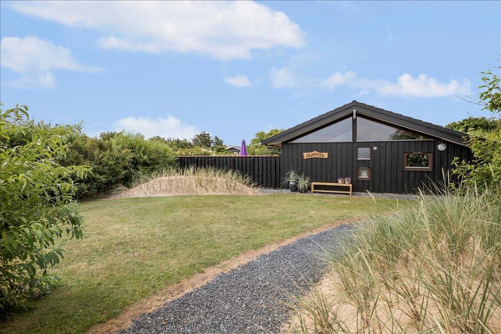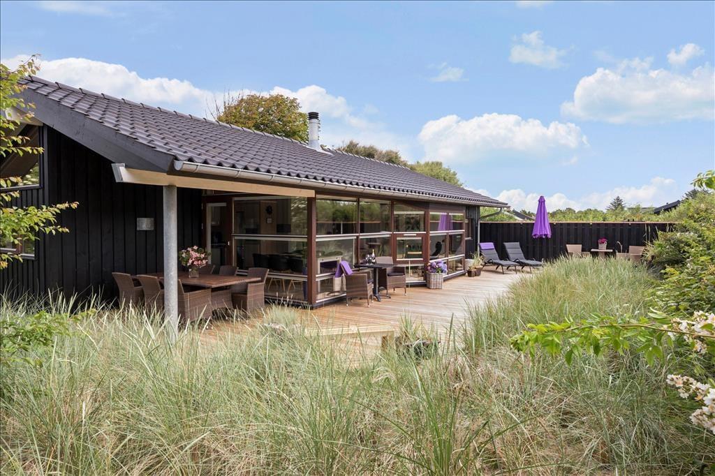 Sommerhuset har en dejlig og delvist overdækket terrasse med gode havemøbler, liggestole og grill. Her kan du sænke skuldrene og bare nyde den friske luft og de smukke omgivelser og i stille vejr lyden fra bølgerne, som slår ind mod kysten.