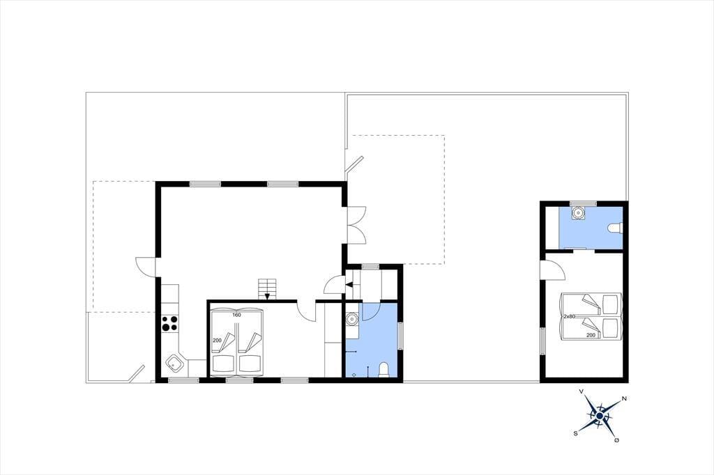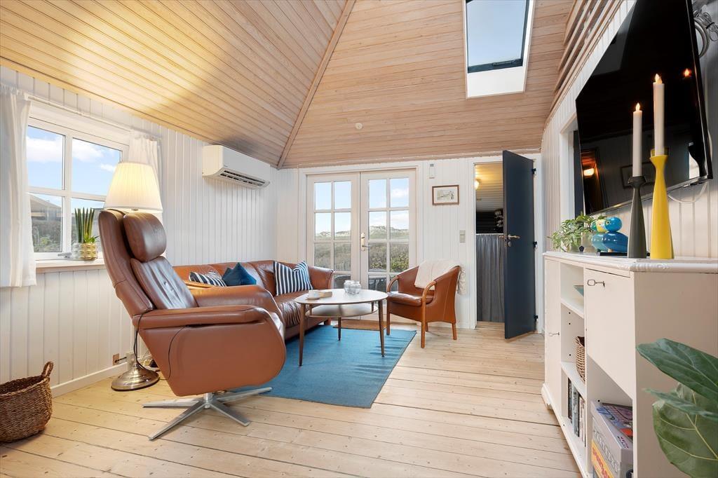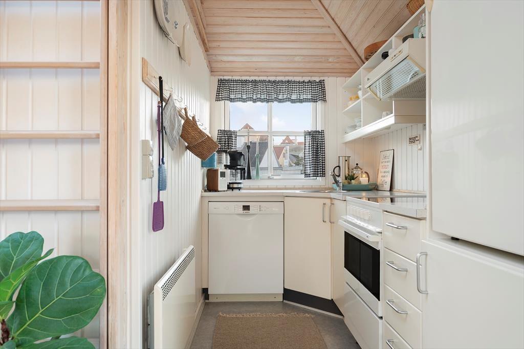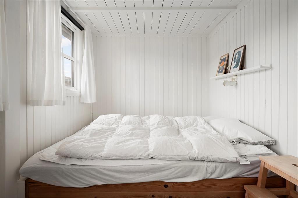 Sommerhuset er hyggeligt indrettet med køkkenet i åben forbindelse til stuen. Sommerhuset indeholder et soverum med dobbeltseng samt en hems med to madrasser. Til huset hører et anneks, som kan bebos fra uge 18 til uge 43. Sommerhuset er lyst og luftigt indrettet. Især det store loftsvindue giver et fantastisk lysindfald og en skøn atmosfære. En dobbelt havedør fører ud til en dejlig terrasse.