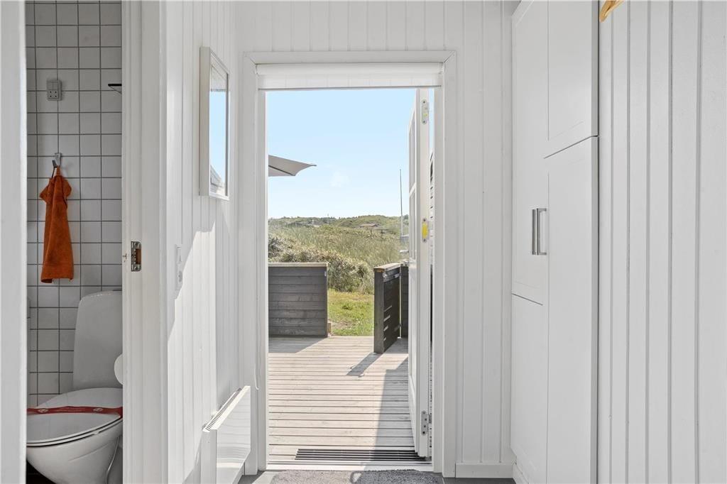 Sommerhuset ligger på en naturgrund med lav bevoksning. Huset er omgivet af tre lukkede terrasser, hvoraf den overdækkede har udgang fra stuen. Her kan man sidde og nyde den fantastiske solnedgang.