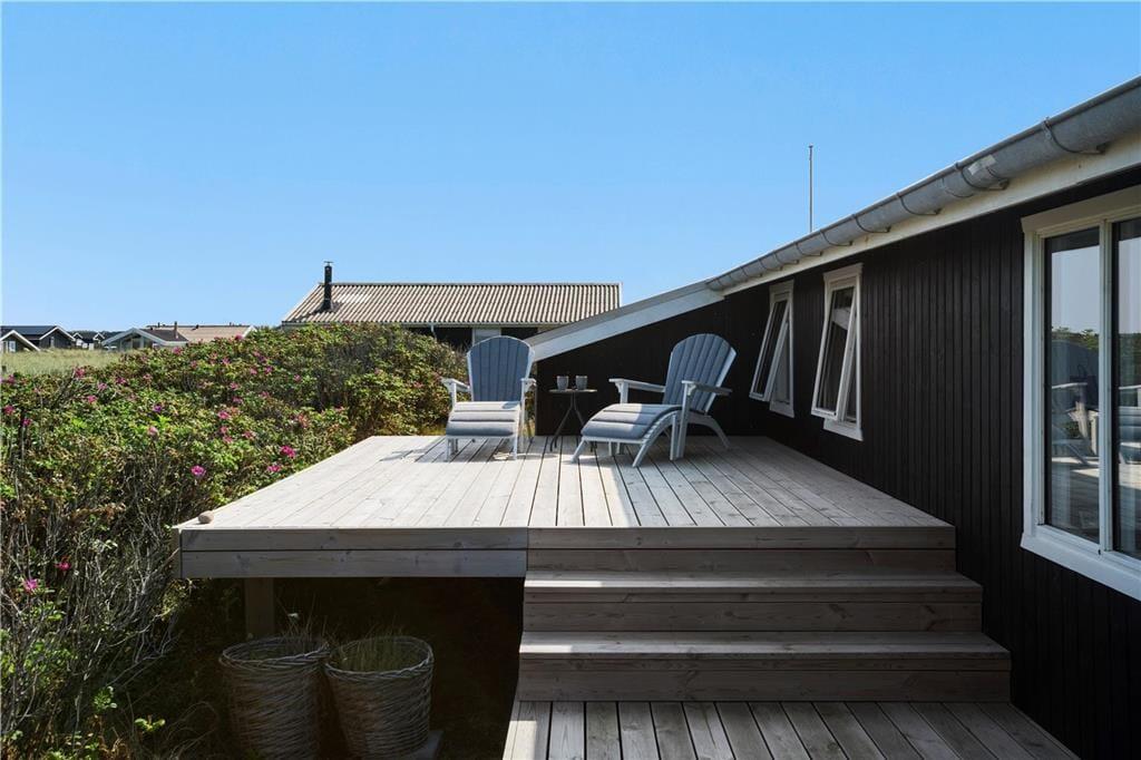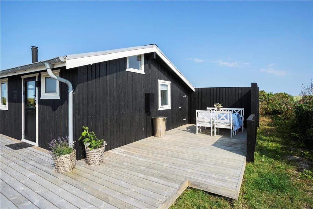 Sommerhuset ligger på en skøn naturgrund, hvor der fra de nyanlagte terrasser er fin udsigt og god mulighed for læ. Terrassen på havsiden er hævet, så bedre og vildere plads til at følge solnedgangen findes ikke. Grill, havemøbler og liggestole er til rådighed for husets gæster.