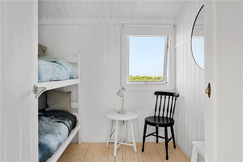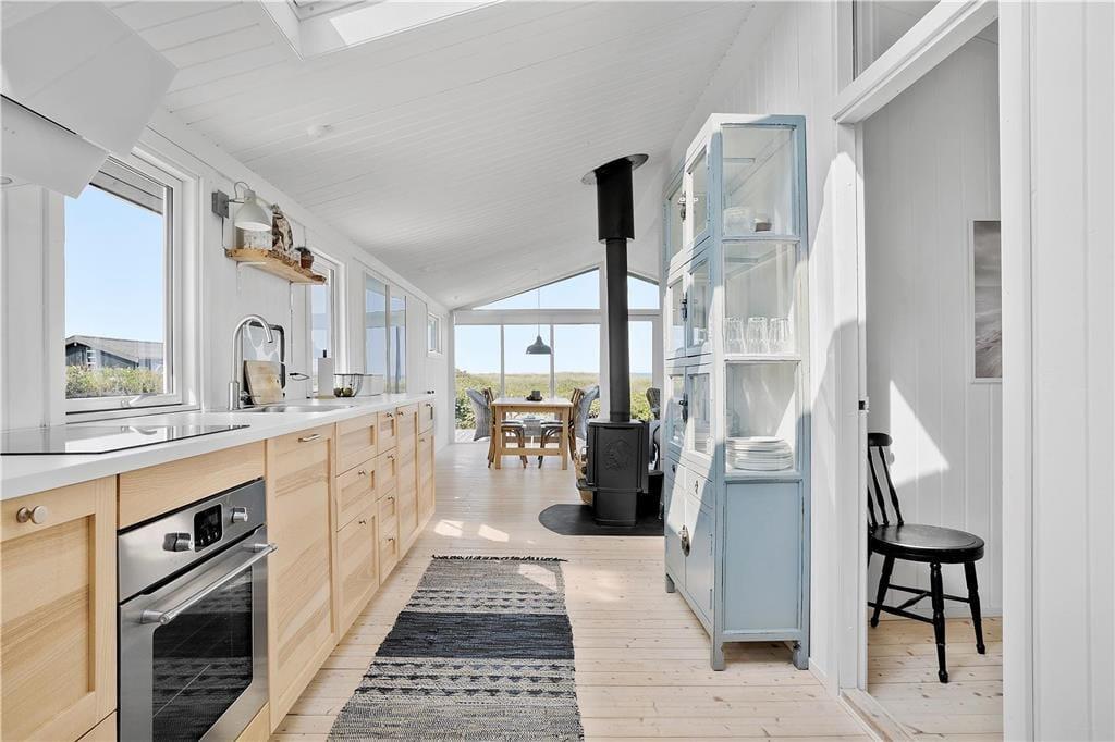 Sommerhuset er gennemrenoveret i 2017 og vil på alle måder være ideelt for en familie- eller parferie. Huset er praktisk indrettet med et moderne badeværelse med brusekabine, 3 soveværelser med hhv. dobbeltseng, køjeseng og enkeltseng samt et centralt placeret køkken. Stuen ligger badet i det nordjyske lys, som strømmer ind ad de store vinduespartier, hvorfra man også kan nyde den fantastiske panoramaudsigt over Vesterhavet. Af samme grund har ejerne fravalgt at have tv i huset, så her kommer man virkelig ned i tempo og har mulighed for at fordybe sig i en god bog, spille kort, snakke, slappe af foran brændeovnen og bare dyrke samværet med familien. Møbler og inventar er nøje udvalgt og hele indretningen fungerer som en harmonisk helhed med hygge og en afslappende stemning i højsædet. Vi er ikke bange for at kalde dette sommerhus for en rigtig perle; det er nemlig meget populært til både en sommerferie og en frisk Vesterhavstur i foråret eller efteråret. Selvom der IKKE er tv i huset, er der naturligvis lynhurtigt internet og Wifi til rådighed, så medbring gerne pc eller tablets hjemmefra.