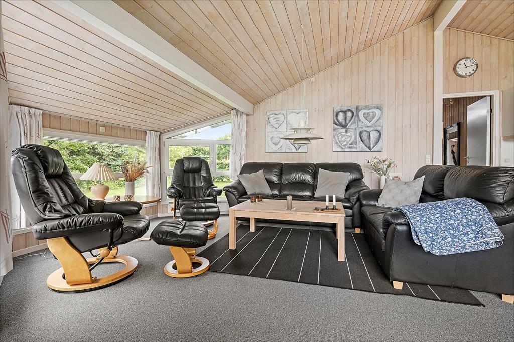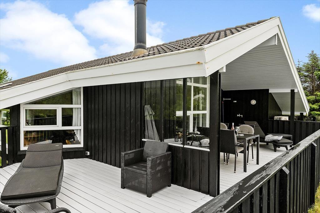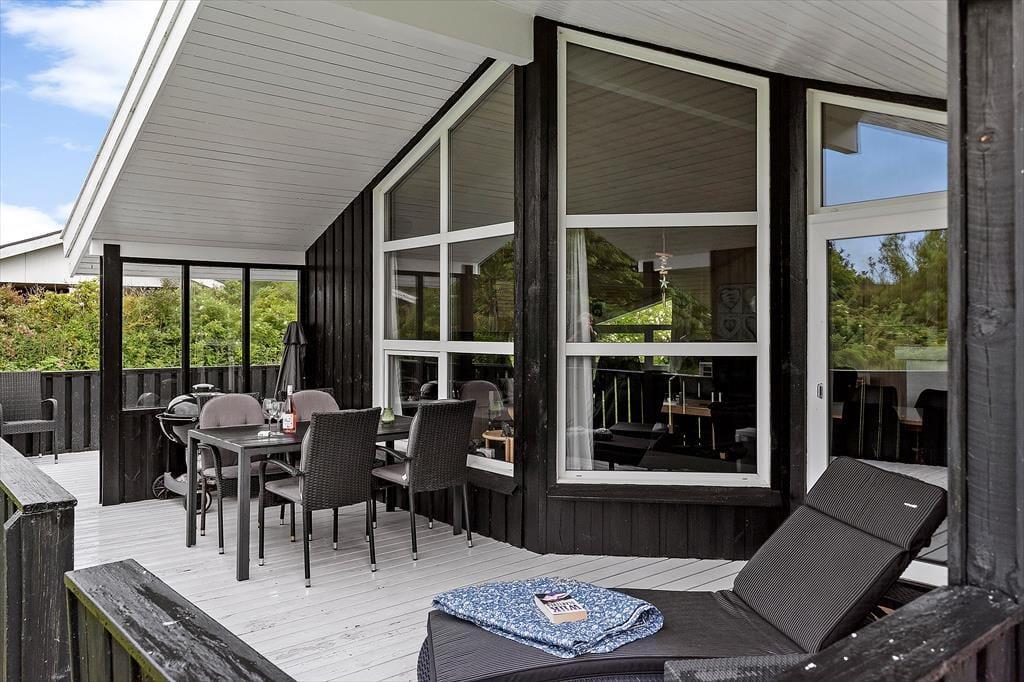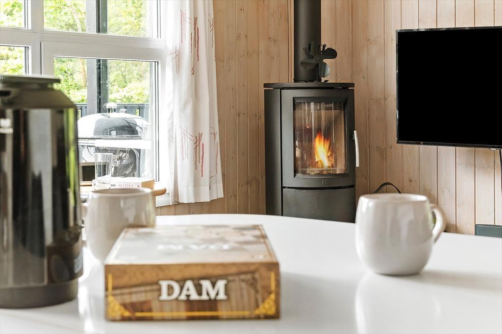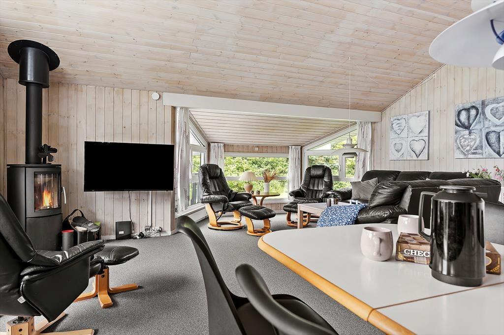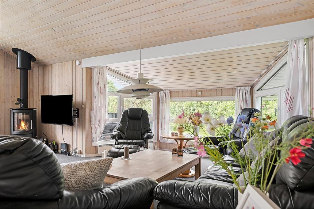 Sommerhuset er flot og smagfuldt indrettet, holdt i lyse farver, så det virker indbydende. Der er et godt lysindfald fra de store vinduer i stuen. Badeværelset råder over både spa og sauna. Fra køkkenet er der adgang til en lukket sydvendt terrasse, hvor man kan sidde helt i læ og nyde morgensolen. Fra stuen er der adgang til sommerhusets delvist overdækkede terrasse. Her har man skøn udsigt over haven med gyngestativ til familiens mindste . Bliver der for koldt udendørs, kan man trække indenfor og lade brændeovnen fuldende den hyggelige stemning.