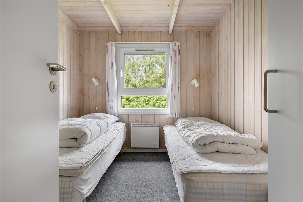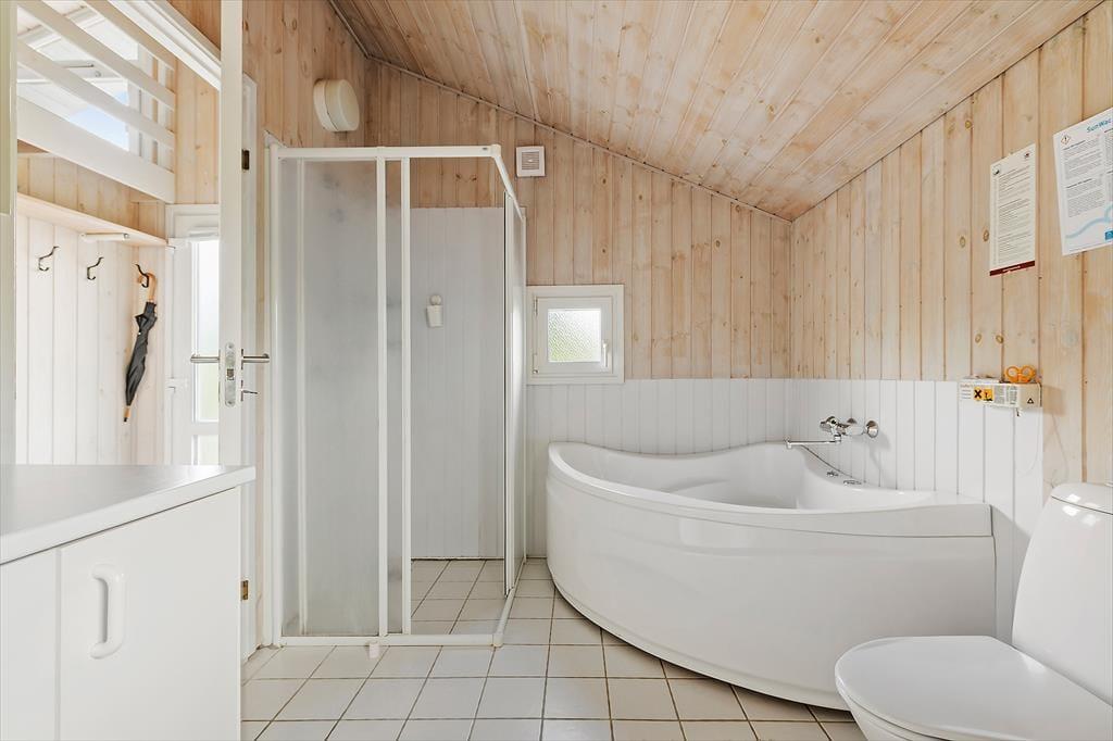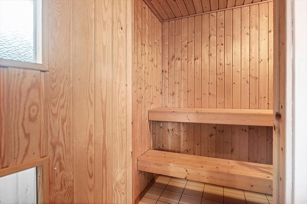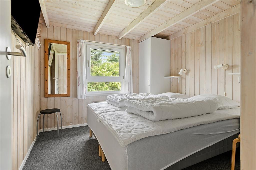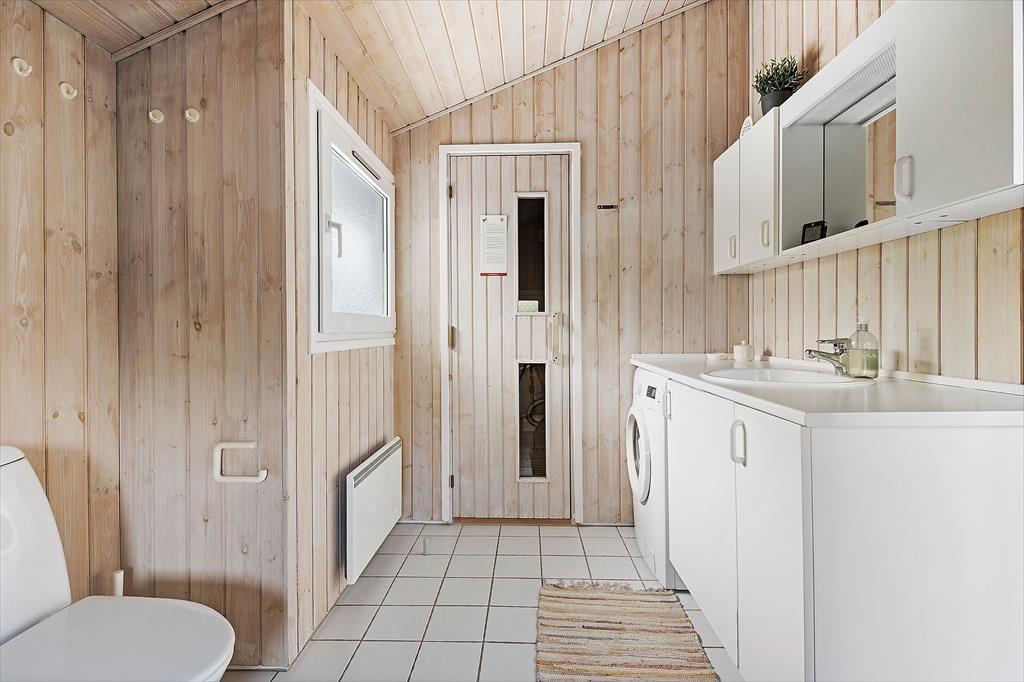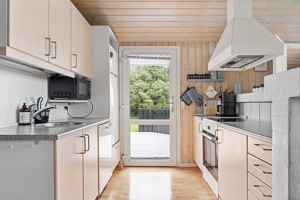 Sommerhuset er flot og smagfuldt indrettet, holdt i lyse farver, så det virker indbydende. Der er et godt lysindfald fra de store vinduer i stuen. Badeværelset råder over både spa og sauna. Fra køkkenet er der adgang til en lukket sydvendt terrasse, hvor man kan sidde helt i læ og nyde morgensolen. Fra stuen er der adgang til sommerhusets delvist overdækkede terrasse. Her har man skøn udsigt over haven med gyngestativ til familiens mindste . Bliver der for koldt udendørs, kan man trække indenfor og lade brændeovnen fuldende den hyggelige stemning.