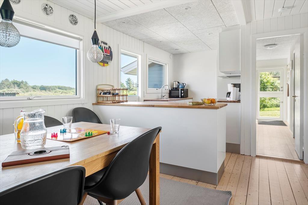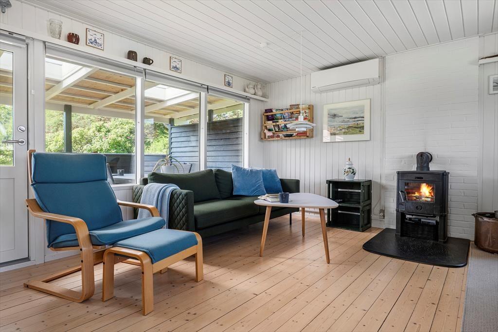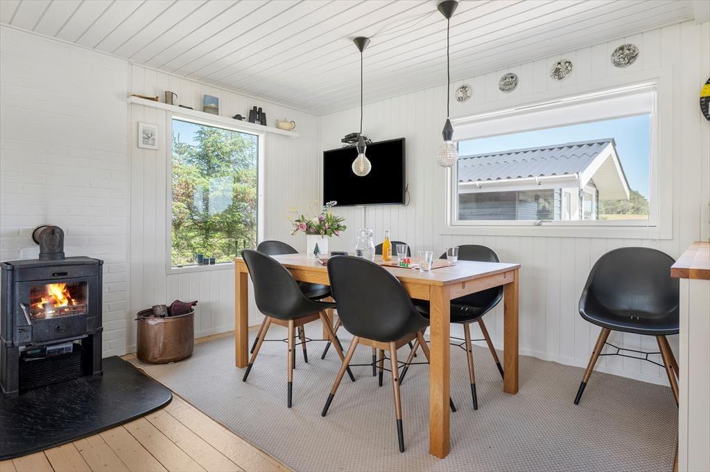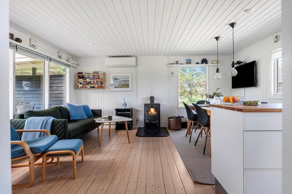 Set udefra ligner sommerhuset en ganske klassisk model med sort træfacade og hvide vinduesrammer. Klassisk kan man bestemt også kalde indretningen inden døre, hvor der er hvidmalede trælister på væggene og brændeovn i stuen. Mange gode opdateringer er dog kommet til på det seneste, så blandt andet har I et lækkert køkken at kokkerere i, og moderne møbler pryder stuen. En herlig detalje ved huset er den flotte udsigt, for mens I står ved køkkenvasken og forbereder aftensmaden, kan I skue ud over et grønt og frodigt landskab. Huset rummer for øvrigt et pænt badeværelse og to soveværelser, og hvis I har brug for ekstra sengepladser, står der en dobbeltseng i annekset.