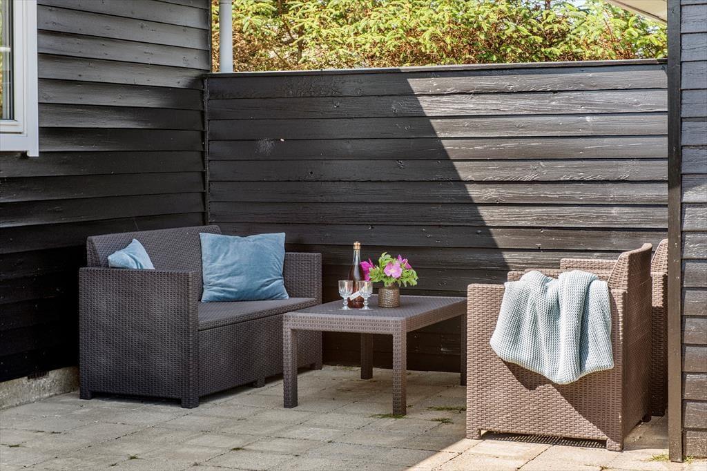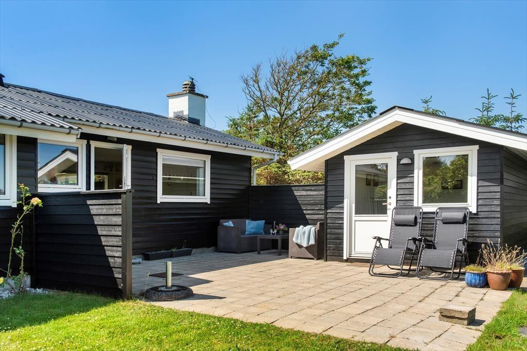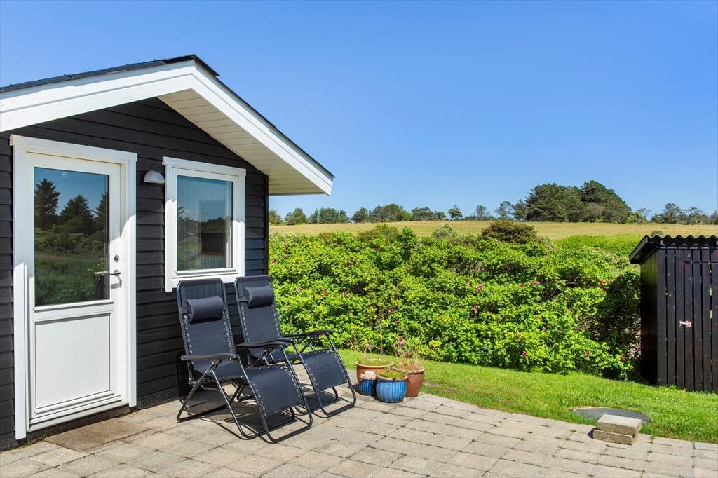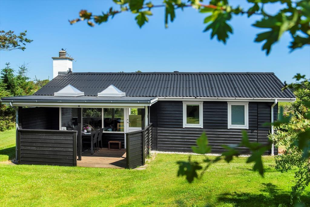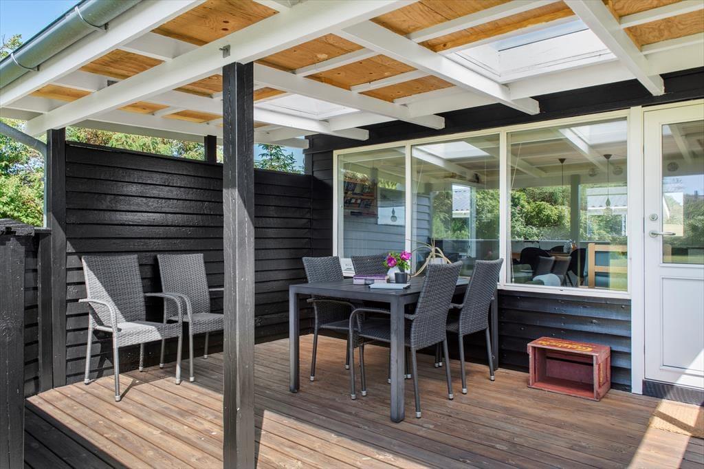 De idylliske omgivelser kan I også suge til jer, når I flytter ferielivet ud under åben himmel. Sommerhuset ligger på en dejlig havegrund, som omkranses af velduftende hybenbuske og anden beplantning, der passer godt til den omkringliggende natur. På græsplænen er der god plads til at lege, og når I vil slappe af i en komfortabel havestol, har I to terrasser at vælge imellem. Den ene er overdækket og den anden helt åben, og begge er skønne steder at nyde fuglesangen, feriefreden og det fine vejr.