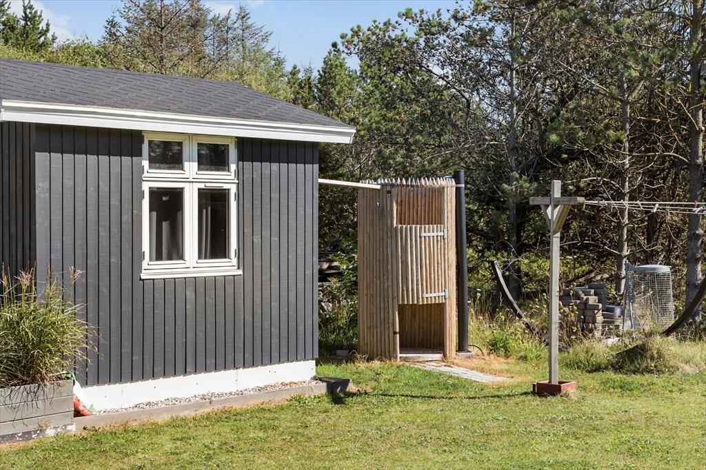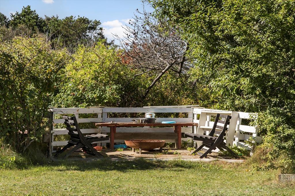 Sommerhuset ligger på en meget stor naturgrund godt i læ af høje grantræer. Der er masser af plads på grunden til leg og boldspil. Den store skønne terrasse foran huset har indgang både til gangen, soveværelset og stuen. Sommerhuset har også en lille østvendt terrasse ud for køkkenet, som især er skøn at nyde morgensolen fra.